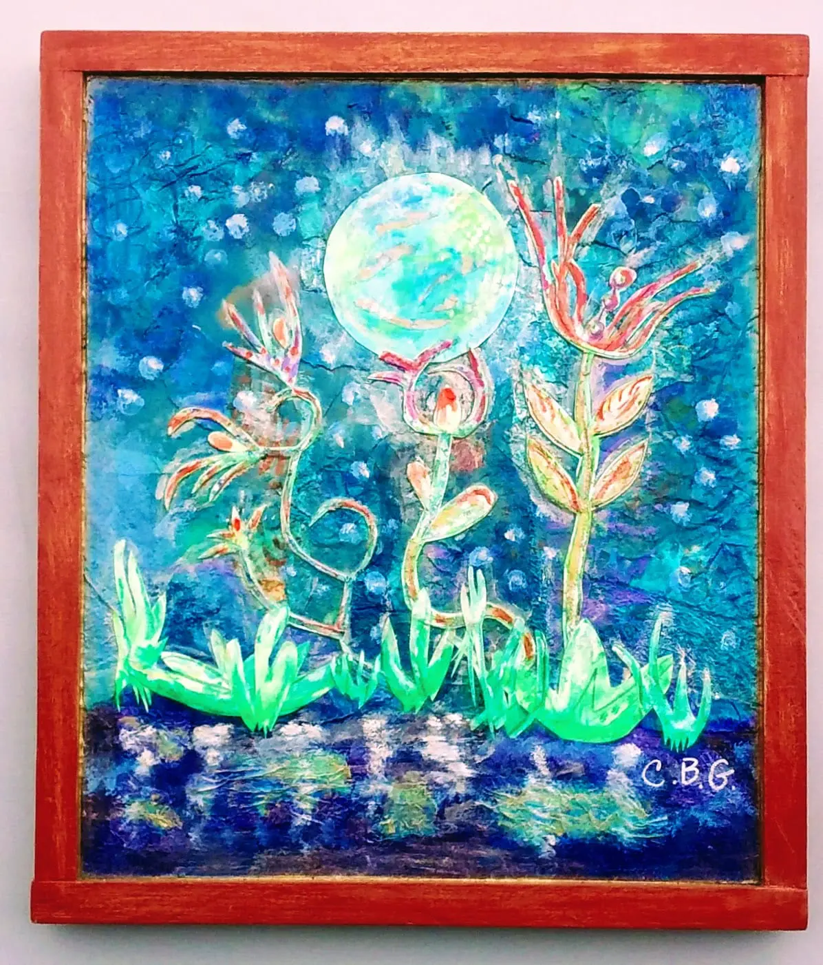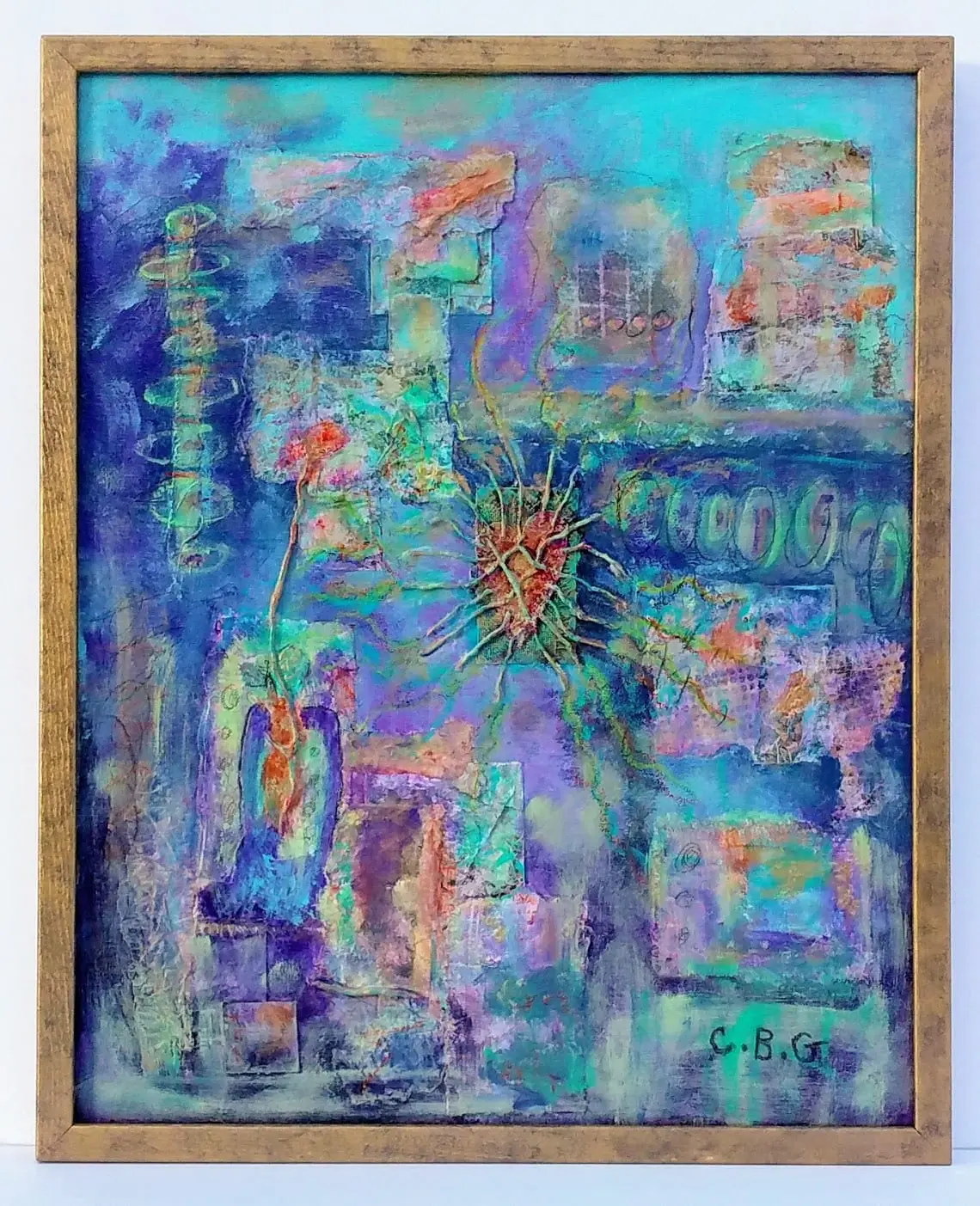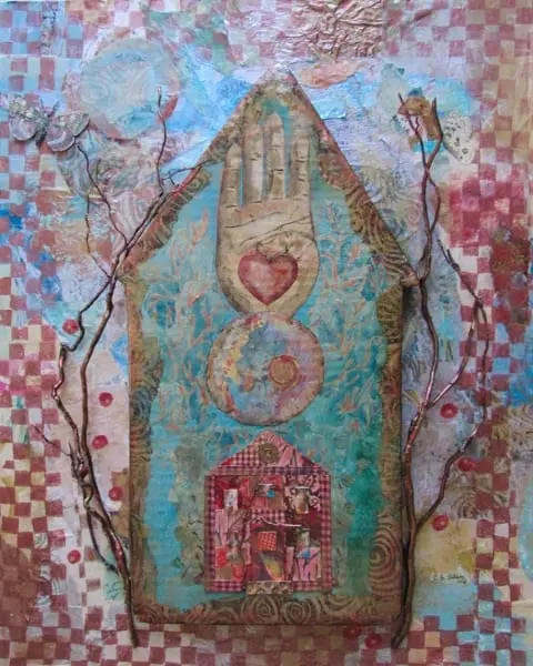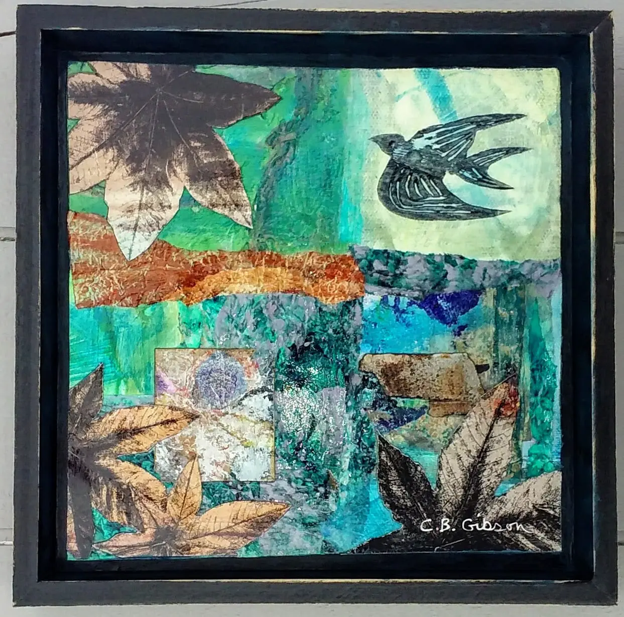 I am inspired by the natural world: a crow talking to his cohorts in my backyard, a gnarled bit of root, or a bumblebee going about its business in the garden. All of these have found their way into my art, which may be made with cloth, a collage of painted and stamped paper, or a combination of both. The art that I make often contains imagery made from a stamp that I carved in rubber,foam,cork or some item that I have recycled, such as sneaker insoles. My studio is in an historic 200 yr. old house.