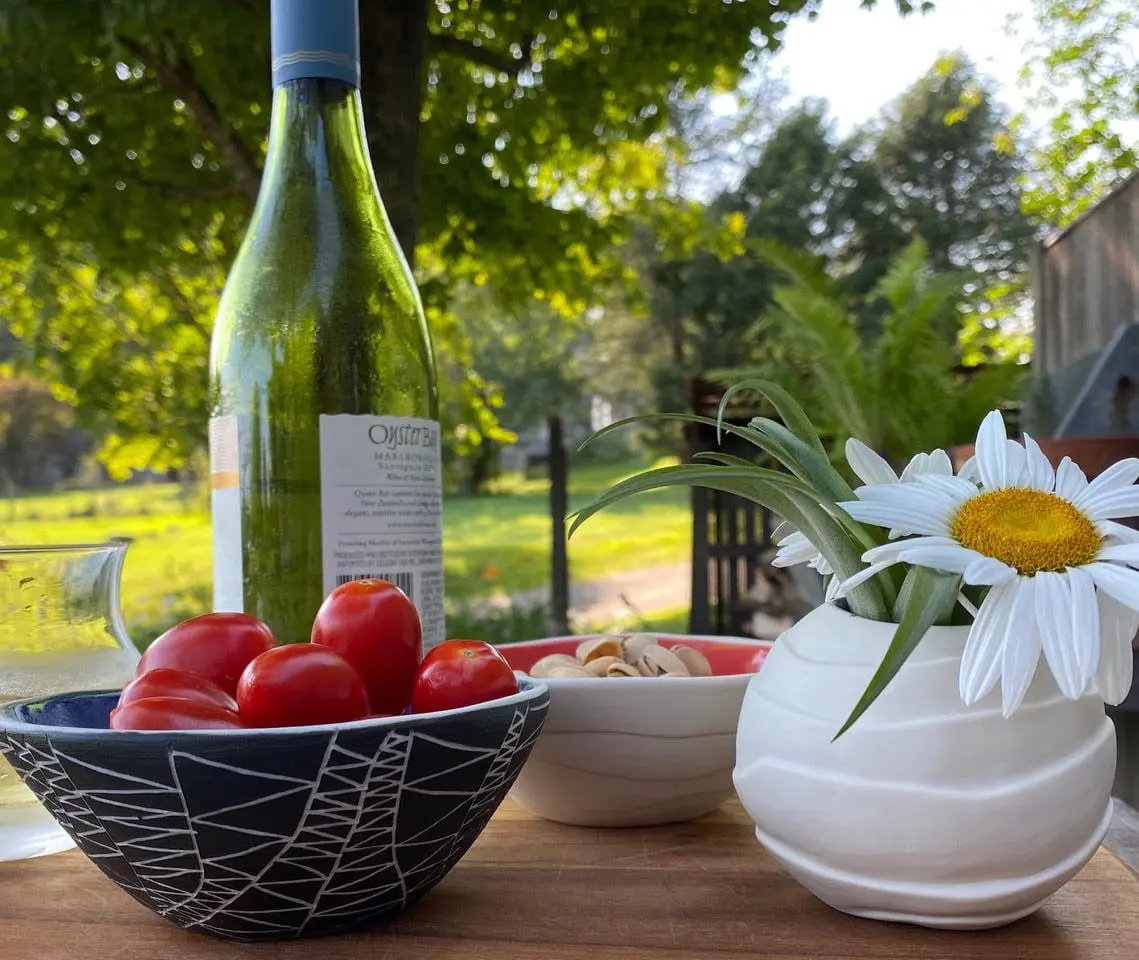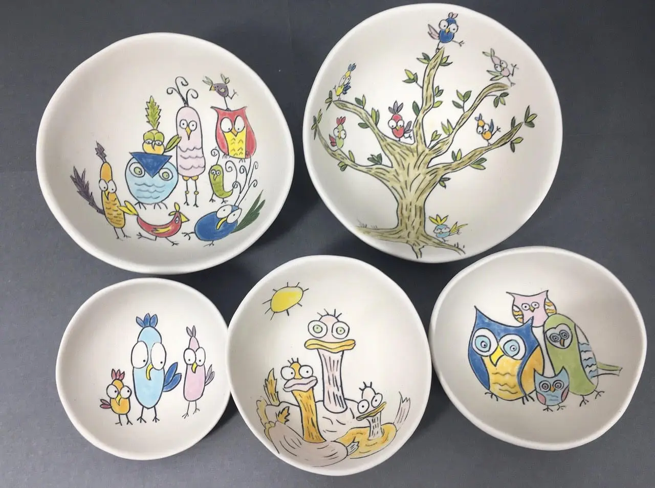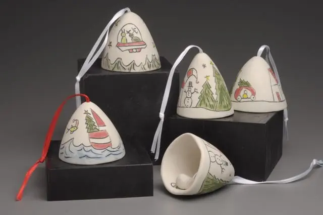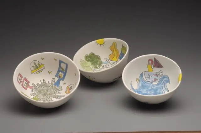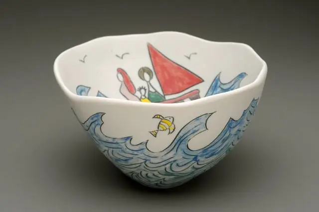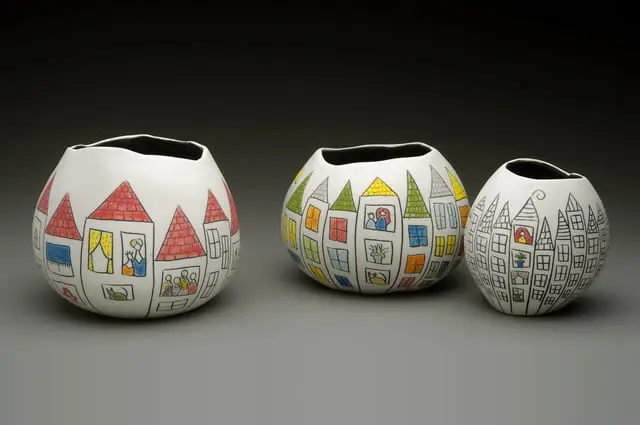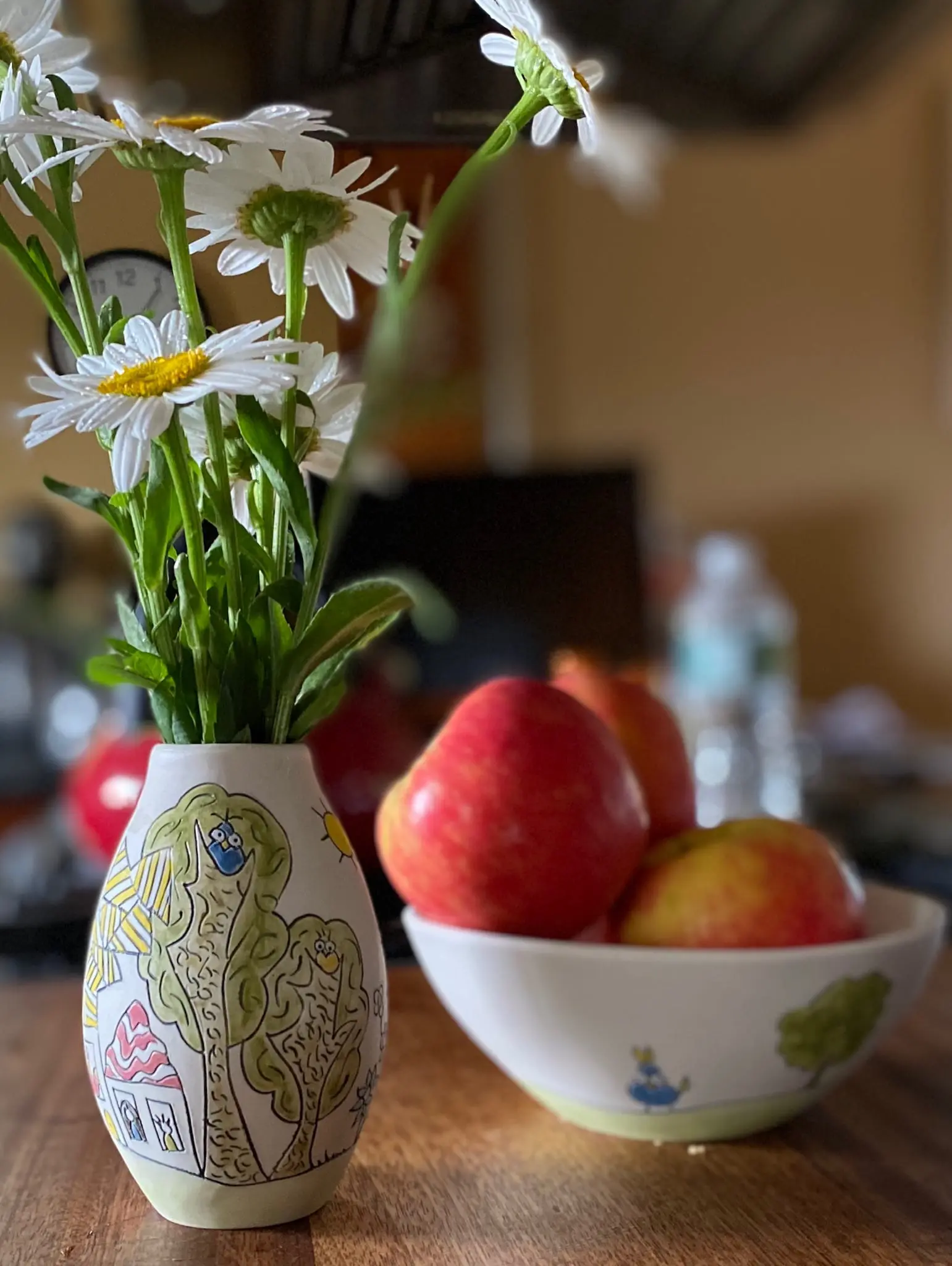 Connie’s work reflects her love of children’s literature and storytelling and her desire to bring a playful lightness into each of her one-of-a-kind pieces. Working exclusively in porcelain, Connie uses hand building techniques to create her forms, uses sgraffito to draw each of her story-themes, and hand paints each tiny house and tree with colored slips. She places her designs on the interior of each and often on their exteriors as well. Connie has a degree in American Studies and Creative Writing from Smith College where she attended as an Ada Comstock Scholar. She returned to clay after a long hiatus. She works in her home studio in York, ME with her husband, Lars.