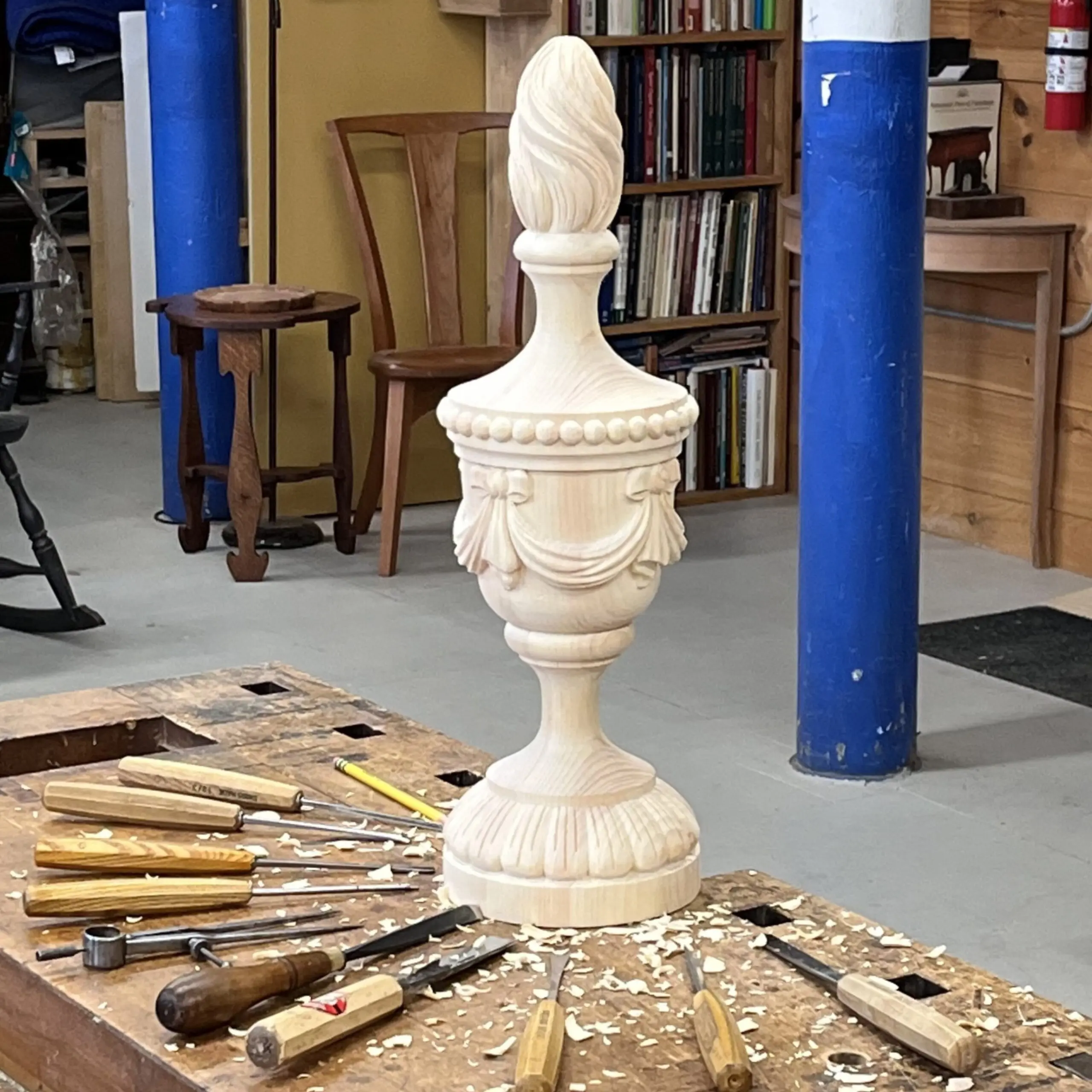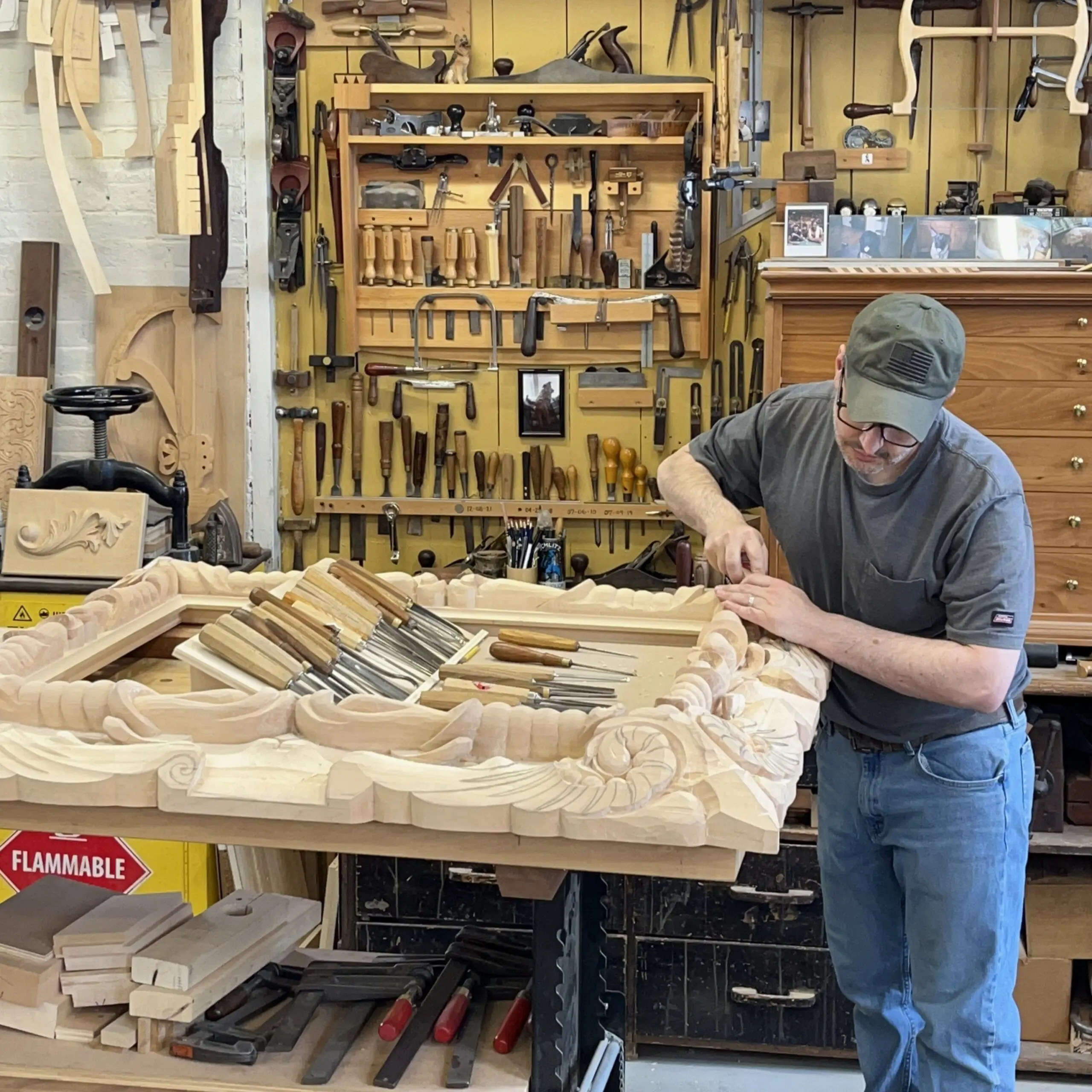 | Daniel Faia has been a professional woodcarver/furnituremaker since 1994. He operates a studio and workshop program in Rollinsford, NH. He is a graduate of North Bennet Street School. In addition to commission work, Dan teaches extensively. His portfolio ranges from furniture to architectural elements and woodcarvings. He has published articles in Fine Woodworking and other media. He produced a video on reproducing a Queen Anne chair for Fine Woodworking. Dan has participated in presentations/exhibits for organizations such as Colonial Williamsburg, Concord Museum, MFA-Boston, and Old State House-Boston. He received the 2023 SAPFM Cartouche Award and the 2024 NBSS Distinguished Alumni Award. |