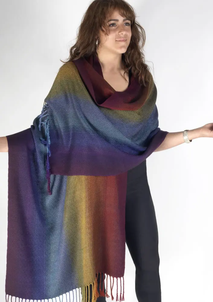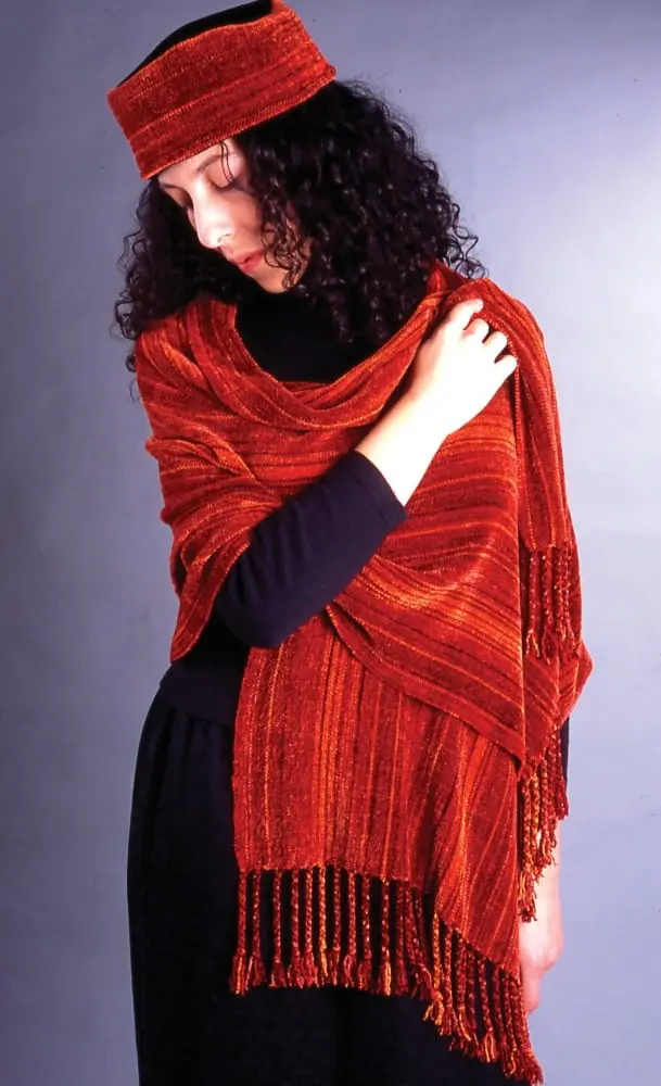Thread by thread, she creates beautiful garments of rayon chenille, tencel, alpaca, and silk – scarves and shawls to drape around your body, hats to keep you warm, blankets for comfort, and garments that feel and look terrific. Her wearable art moves and glows, combining structure, form, and drape, with the intricate color play that happens between the threads.