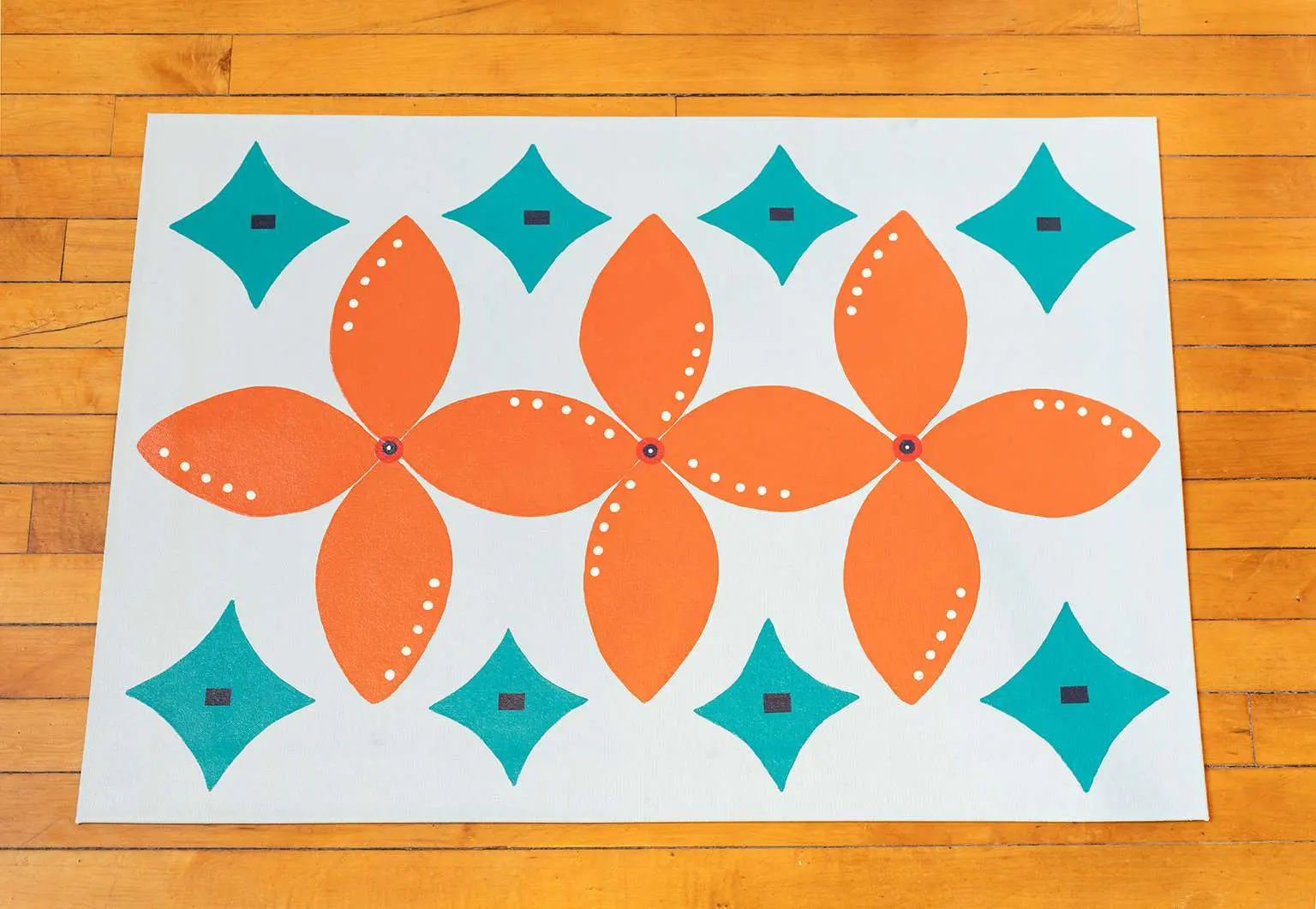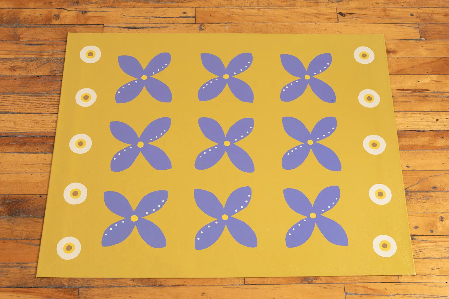 I create hand-painted canvas rugs for the home. They add color, character, and style to any room.