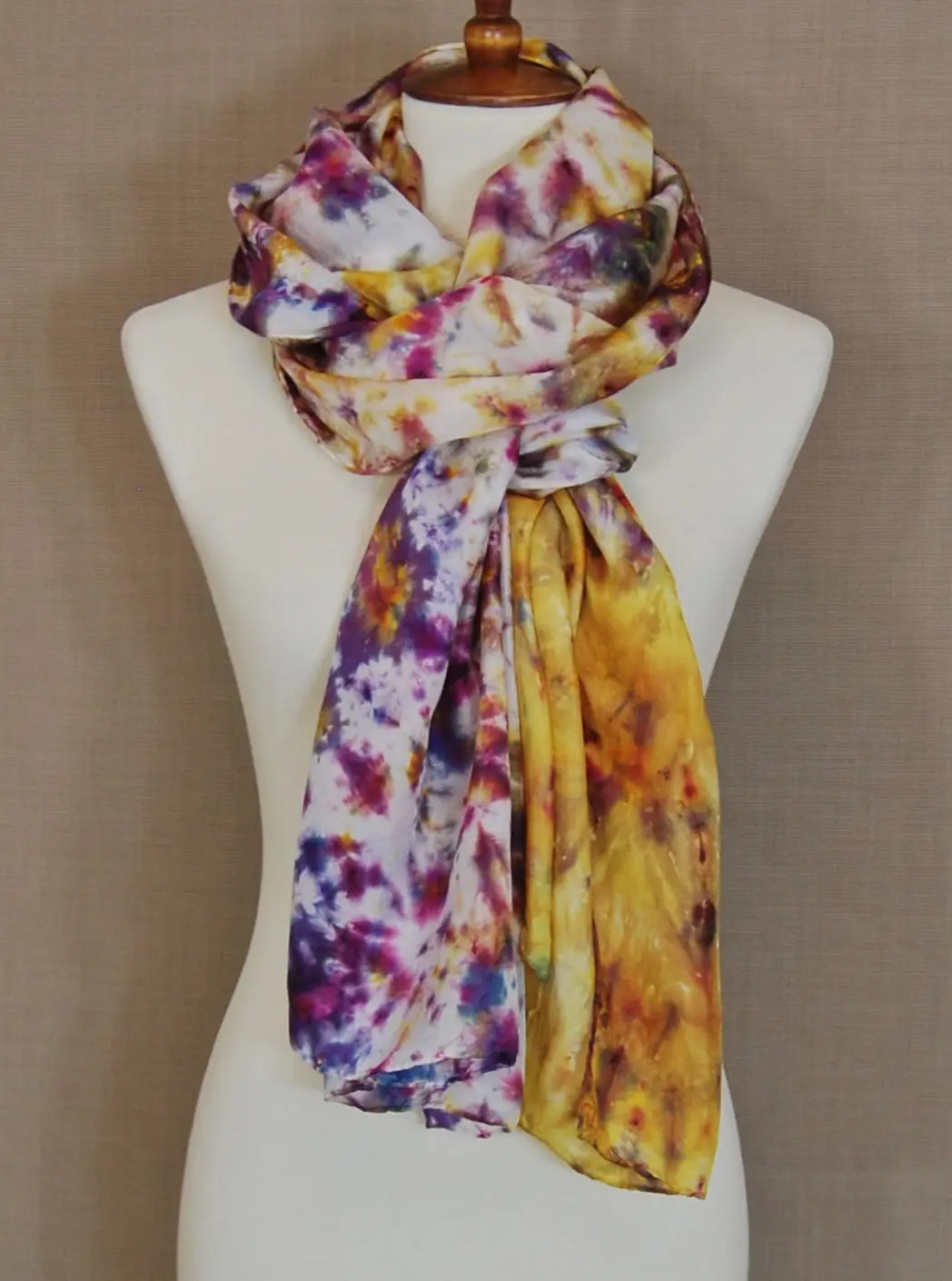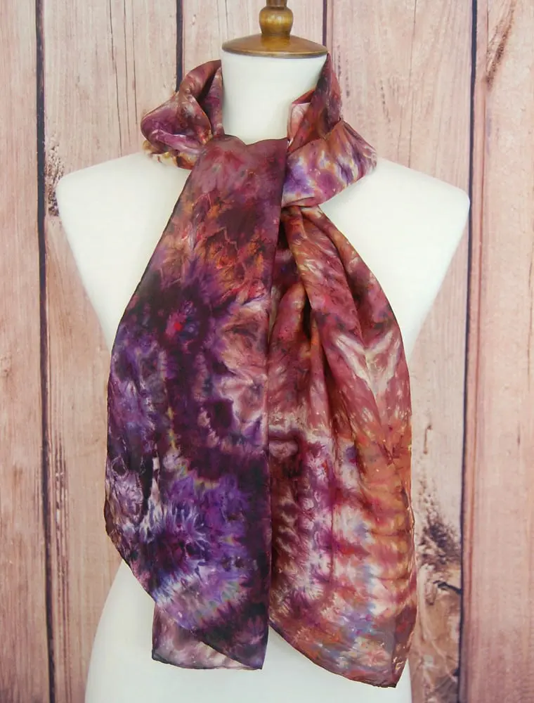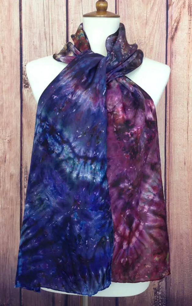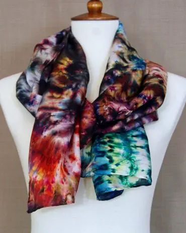 My craft is one of discovery as I explore unconventional methods using two different classes of dyes to create an exceptional variety of depths and tones. I am captivated by the whimsical dances of dyes to laws of nature and mysteries of science as they wick and flow through silk. My pieces often change from one end to the other so that they may be worn to a variety of complementary effects.