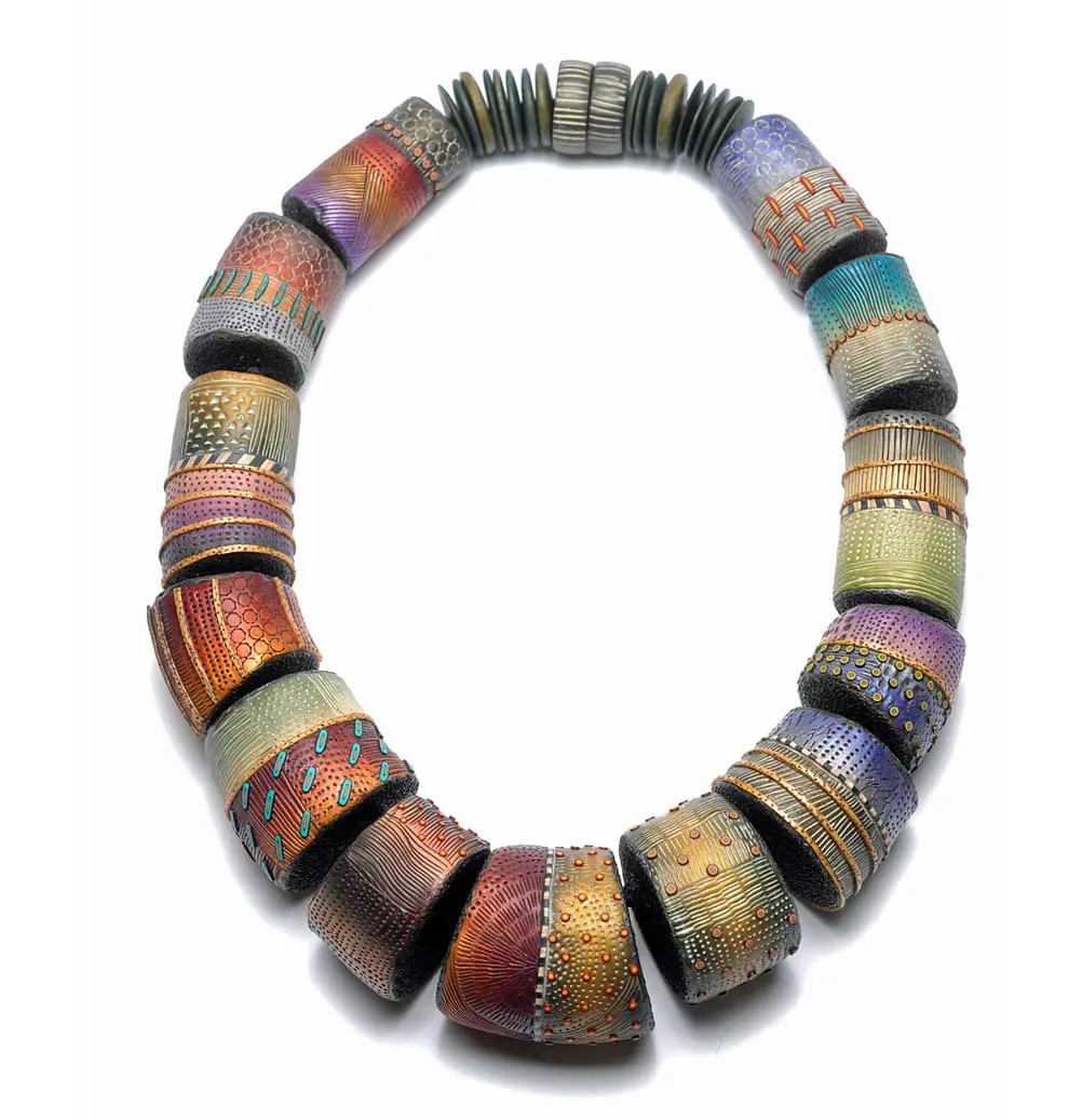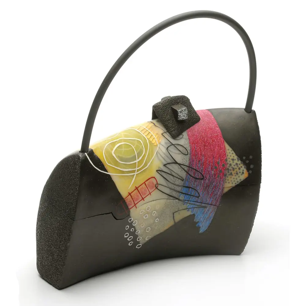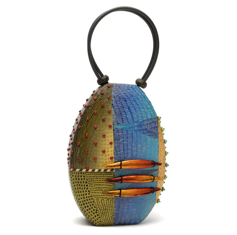 Kathleen is widely recognized as one of the world’s leading polymer clay artists. Her exquisite sculptural evening bags pay attention to the natural shapes, repetition, and colors she finds in the woods of New Hampshire. Kathleen has an MFA from Arizona State University and has been working exclusively in polymer clay since the mid 1980s. She teaches workshops around the US and Europe, curated a polymer exhibit for the Fuller Craft Museum in 2009, and has work in the permanent collections of the Boston Museum of Fine Arts, Philadelphia Mueum of Art, Mingei Museum of San Diego, Racine Art Museum, Newark Museum of Art, and the LNHC Permanent Collection.