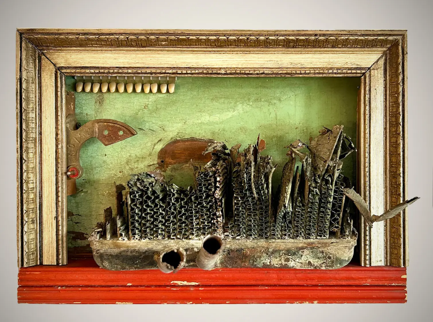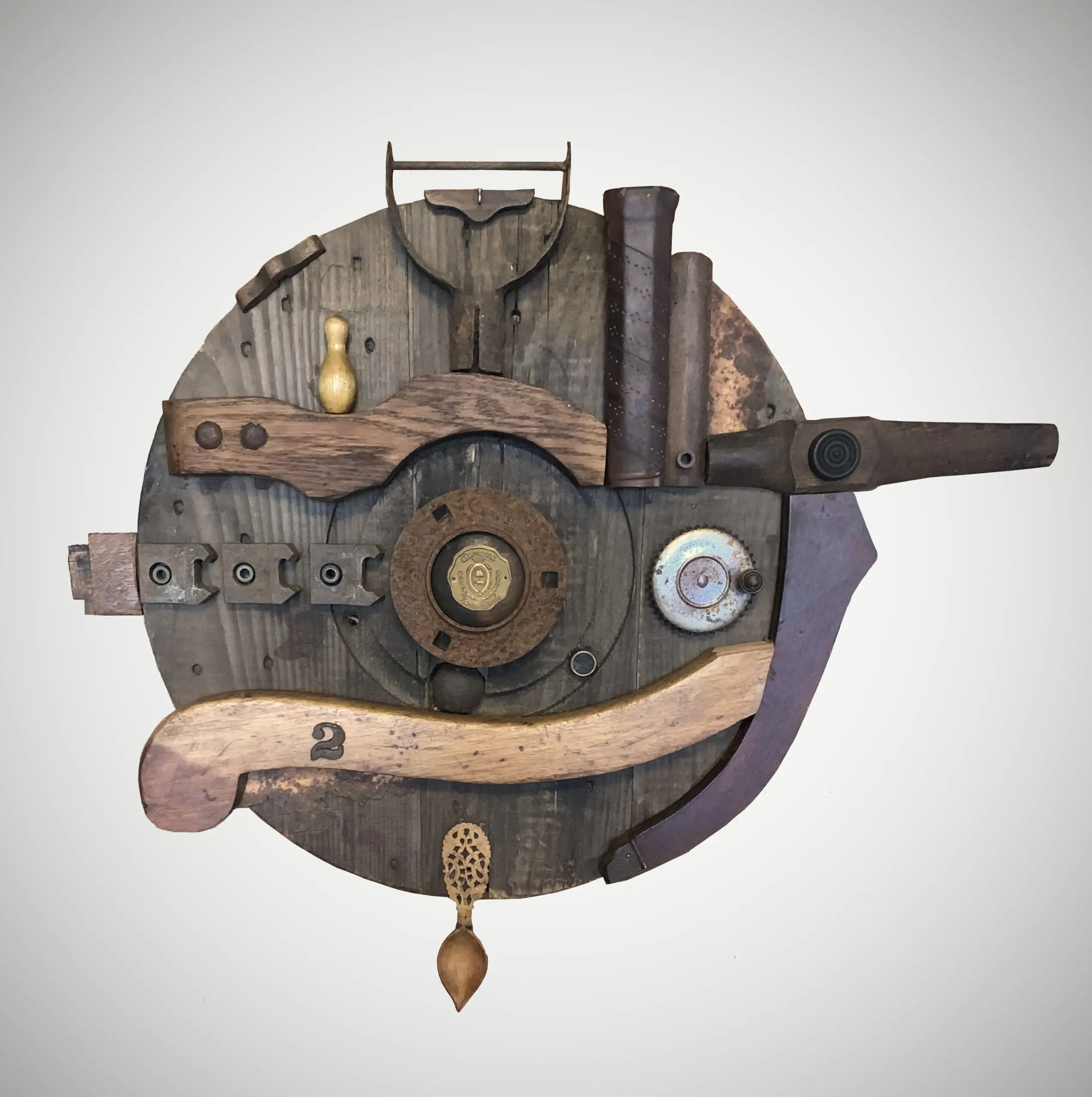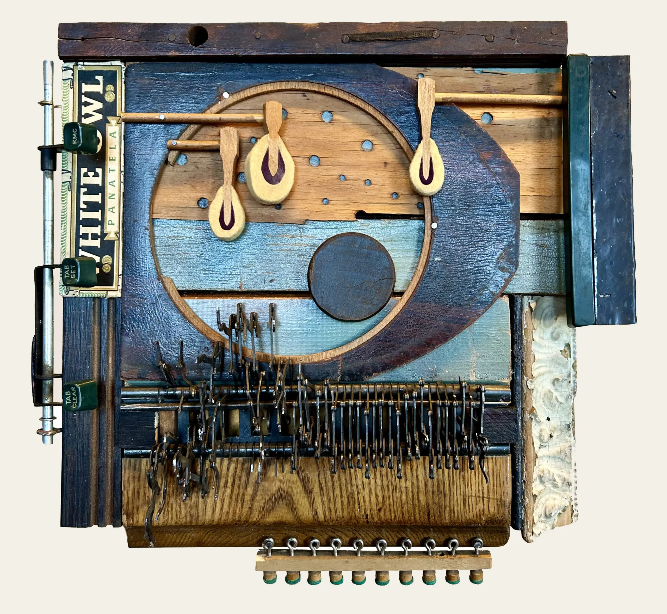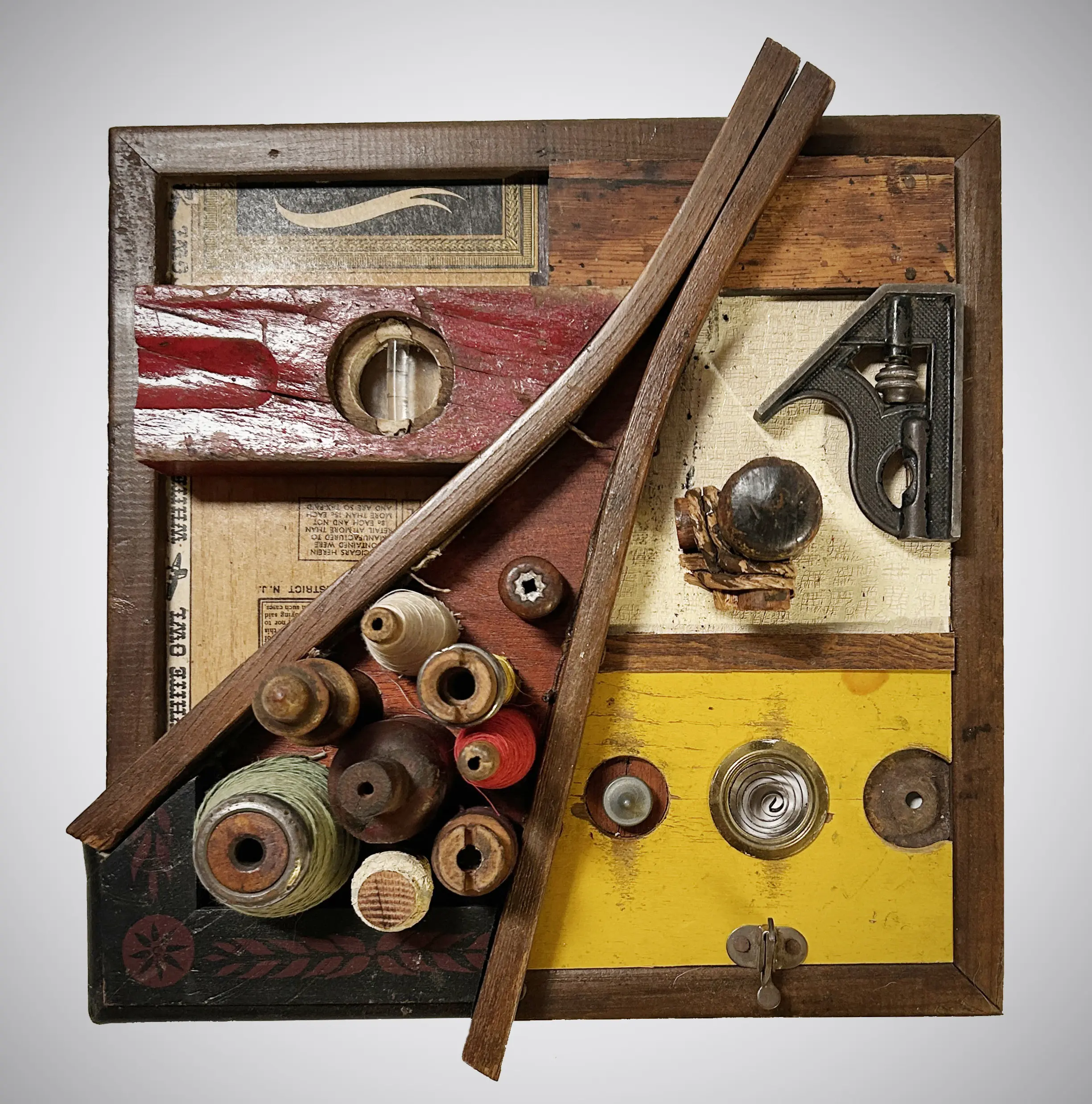 | Kathy Kemp, an assemblage artist from MA now based in VT, works with found and timeworn materials to create modern compositions that explore balance, renewal, and quiet tension. Years in geriatric care shaped her respect for endurance and for age as a record of living. Through her assemblages, she invites viewers to look closely—to notice the eloquence of the overlooked and to find, in transformation, both dignity and renewal. The pieces lead the process, their forms and histories guiding compositions that rest between stillness and motion, memory and design.
