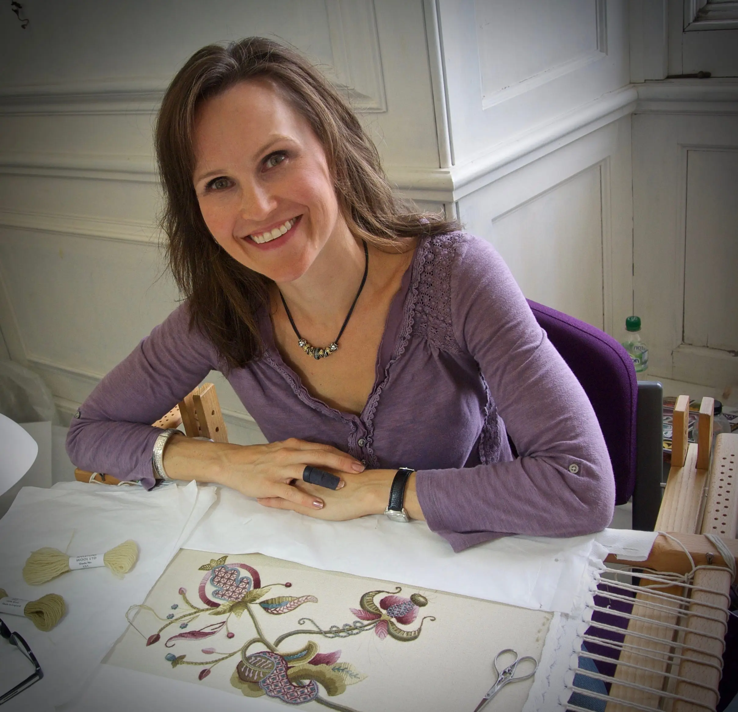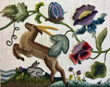 Kirsten Doogue is a fiber embroidery artist specializing in hand embroidery techniques. She began embroidering as a teenager when her mother taught her crewelwork, needlepoint, and cross stitch. She quickly realized that embroidery stirred up an inner sense of accomplishment, artistry, and relaxation that was both gratifying and appealing. College studies in Chemistry and Electrical Engineering required her to complete intensive and detail oriented design projects that provided a similar sense of accomplishment (but not relaxation!) and put her embroidery work in a temporary holding pattern. After college, she pursued a “day job” in engineering and marketing and branched out into a plethora of new fiber arts in the evenings and on weekends. Learning new techniques became a true passion – and new pursuits included knitting, smocking, needle felting and whitework (among others). Discovering some of the less represented 17th Century English fiber techniques changed her path once again. Kirsten pivoted in her craft and decided to refine her interests. Kirsten’s current work is focused on Jacobean crewelwork, goldwork, and silk stumpwork. In order to augment her knowledge and skill, she completed the Royal School of Needlework’s Certificate in Technical Hand Embroidery, Embroiderers’ Guild of America’s classes, and numerous online classes. Kirsten has also strengthened her techniques by studying historic pieces in the Victoria and Albert Museum’s collection (many thanks to the museum for allowing private viewings). This research has provided illuminating details of stitch composition as well as threads of the time.In 2018, Kirsten was accepted into the League of New Hampshire Craftsman and recognized as a Master Craftsman in Crewel Embroidery by the Embroiderer’s Guild of America.