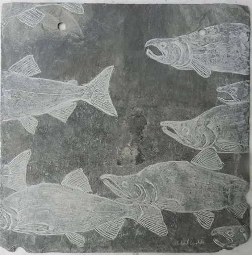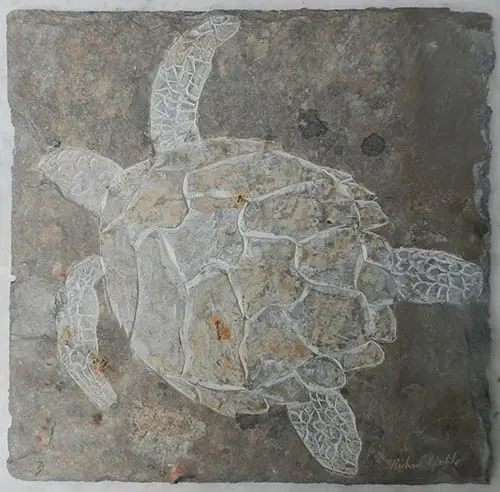 Michael Updike graduated from Mass College of Art and received his MFA from Vermont College. He is a long standing North Shore artist. Trained as a sculptor, he recently began creating artistic personalized memorial stones as well as unique slate carvings. His work challenges the pictorial paradigms of additive imaging. “I honed my carving skills on old slate roof shingles which then became my primary medium. I use slate with outward signs of wear. Paint, tar, nail holes, fractures, chips and flaking tell of the slates former utilitarian life. The scars of its history rest on its surface while I cut through the patina revealing fresher layers of stone.”