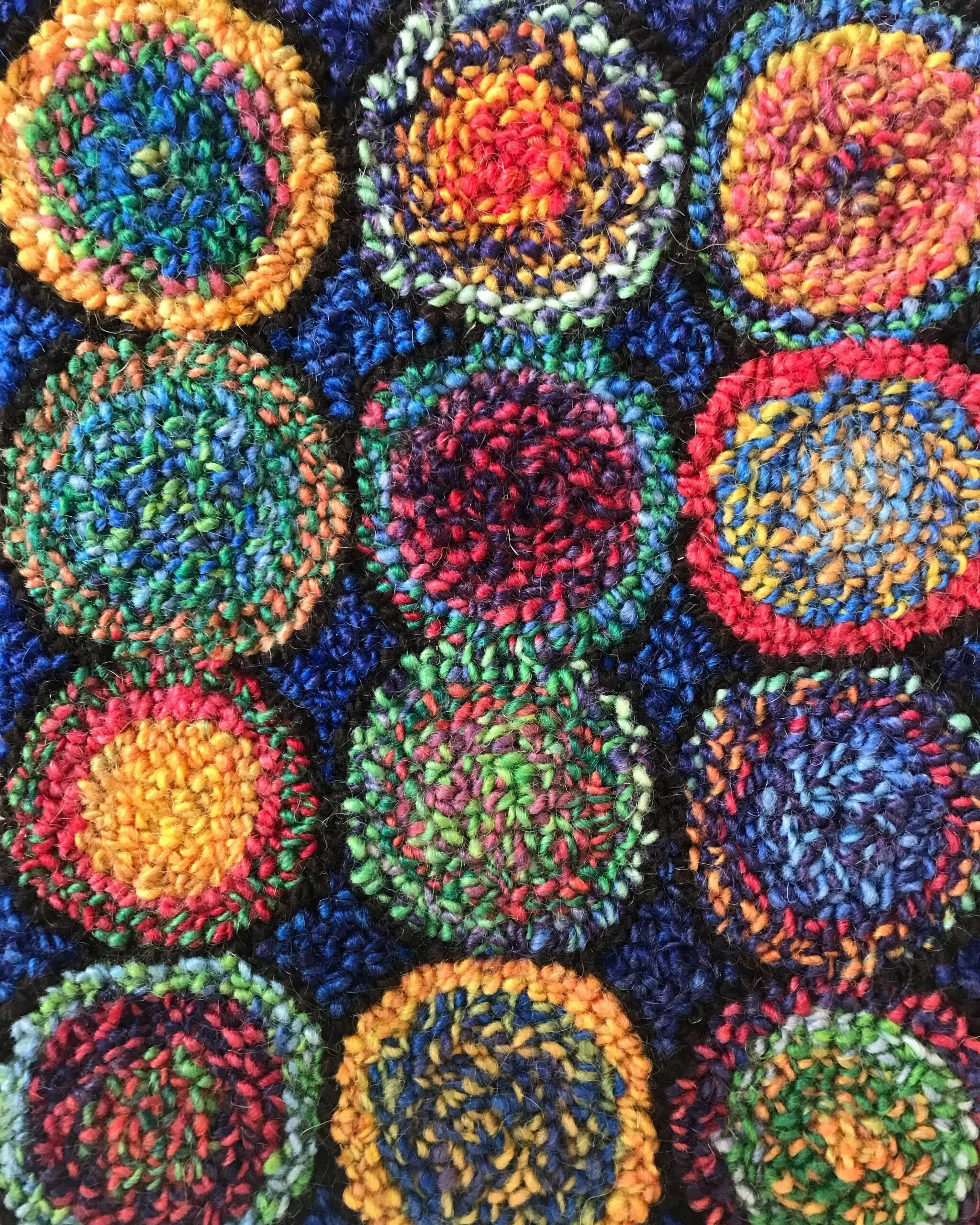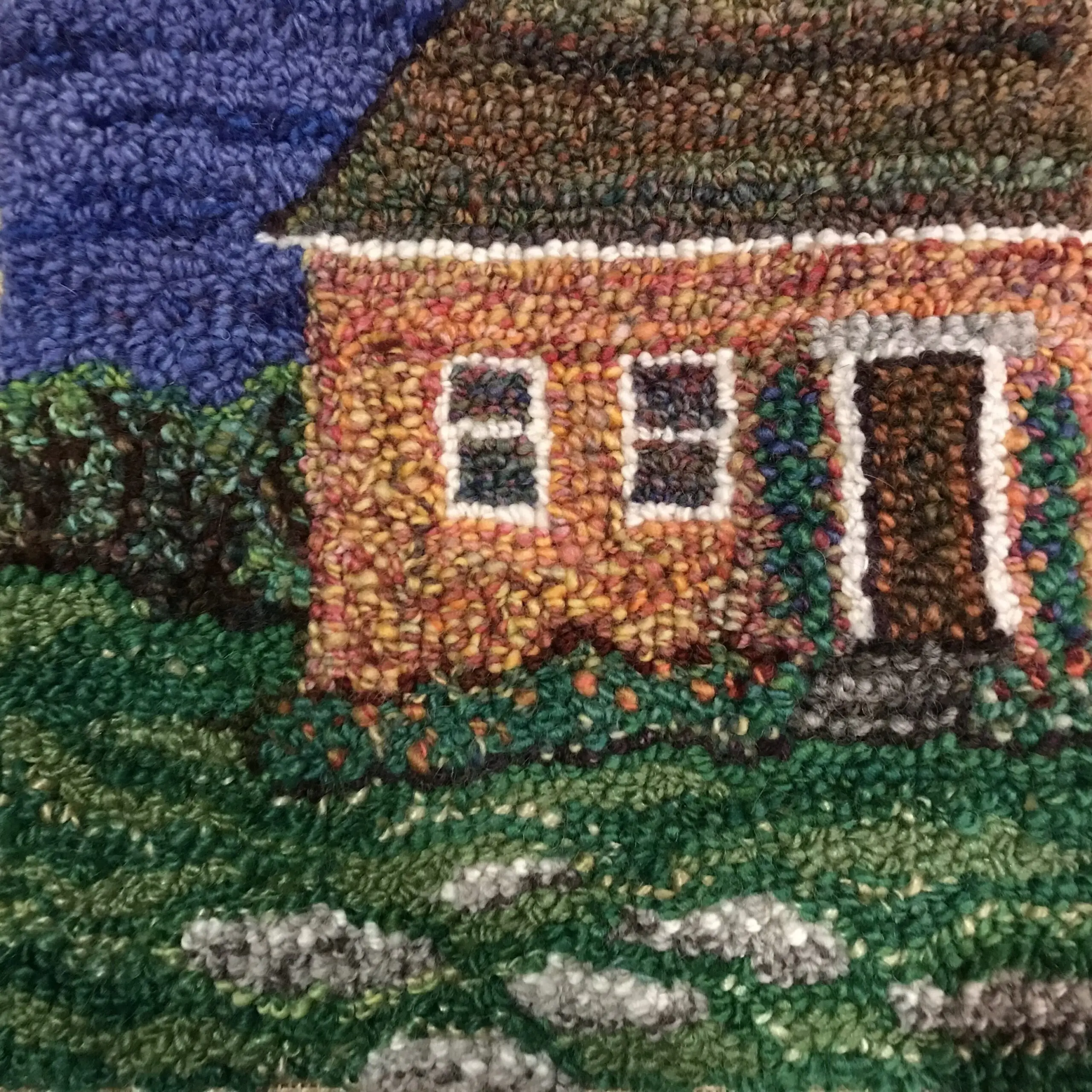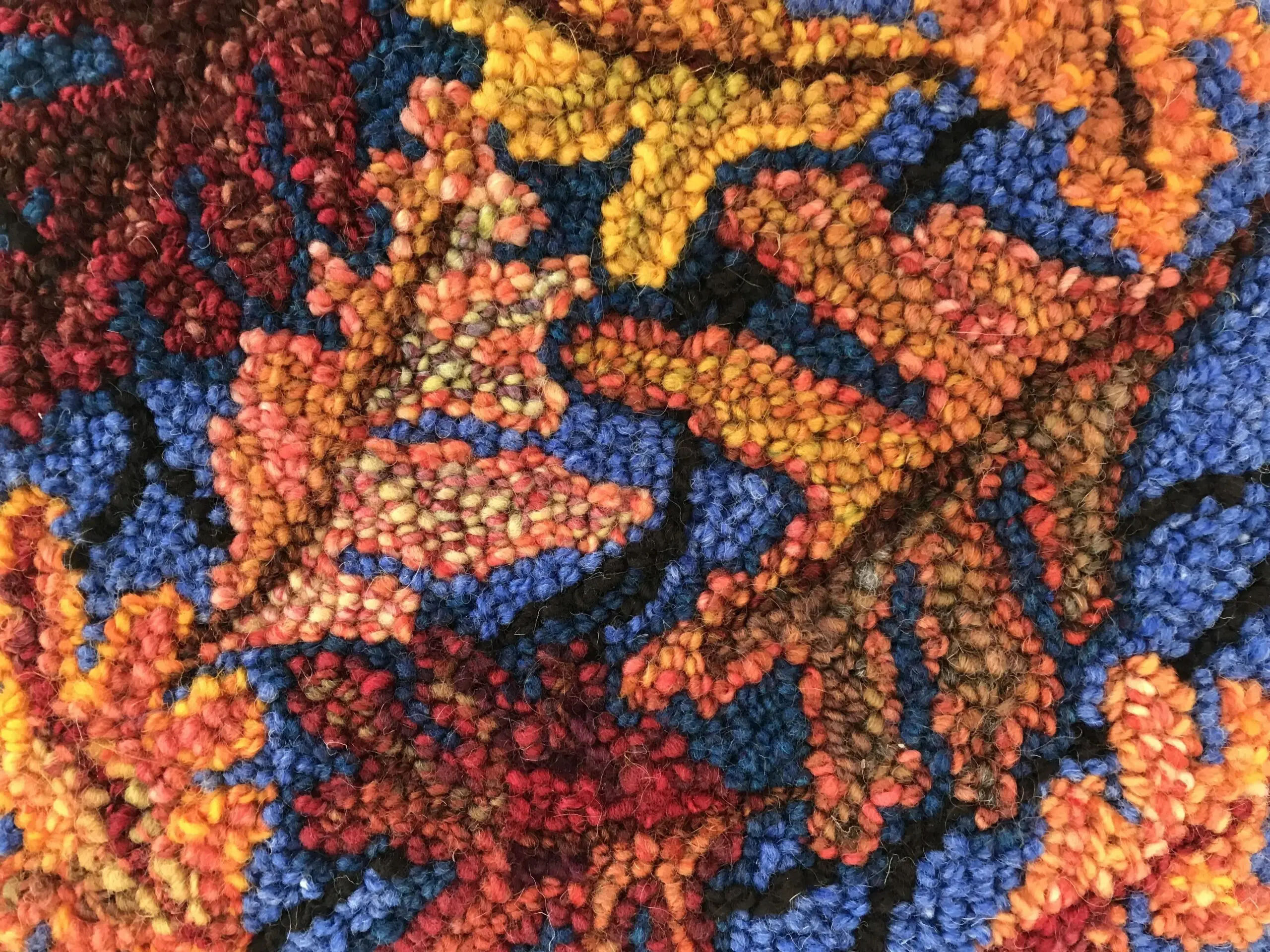 My current work reflects an exploration of color in dyeing, spinning, and rug hooking. The hooked mats are made with locally sourced wool that I’ve hand dyed and spun into yarn. I generally sketch from life or photos to develop an idea for a hooked mat, finding inspiration for both the image and color in nature. The image continues to change as the piece evolves.