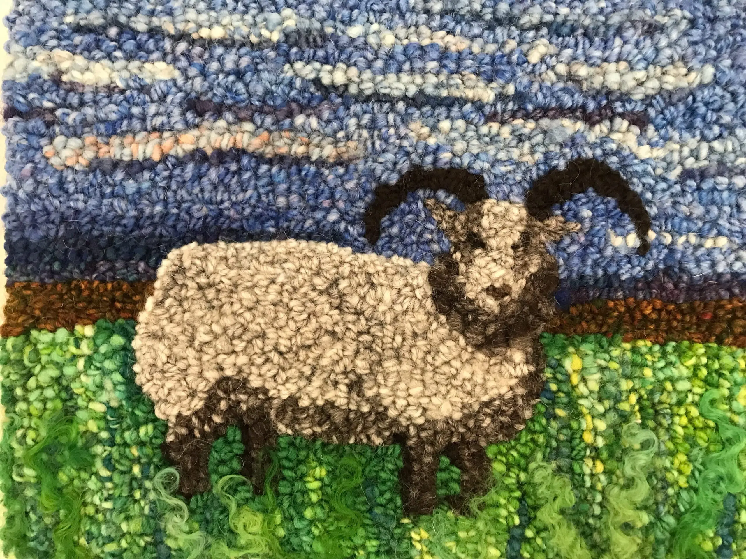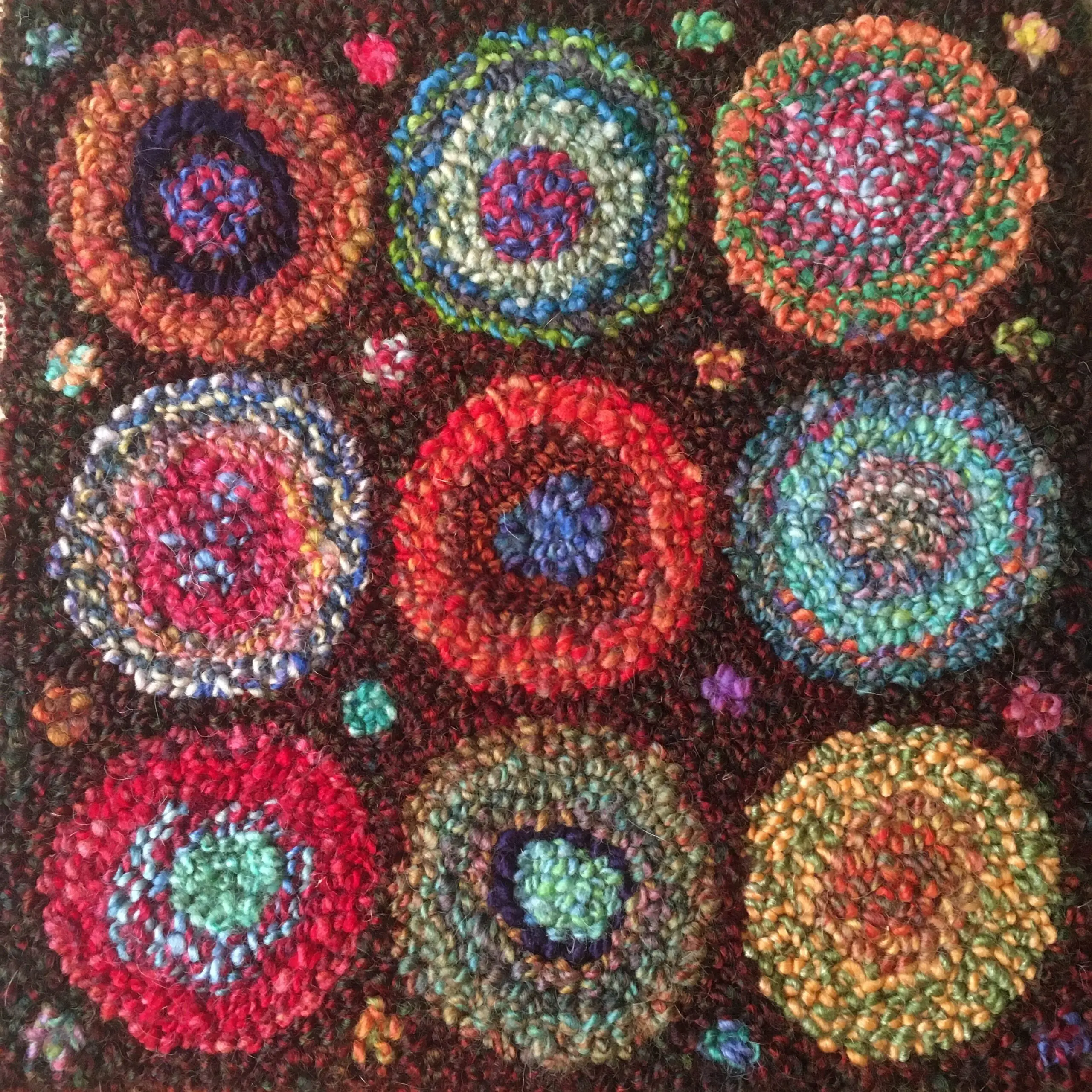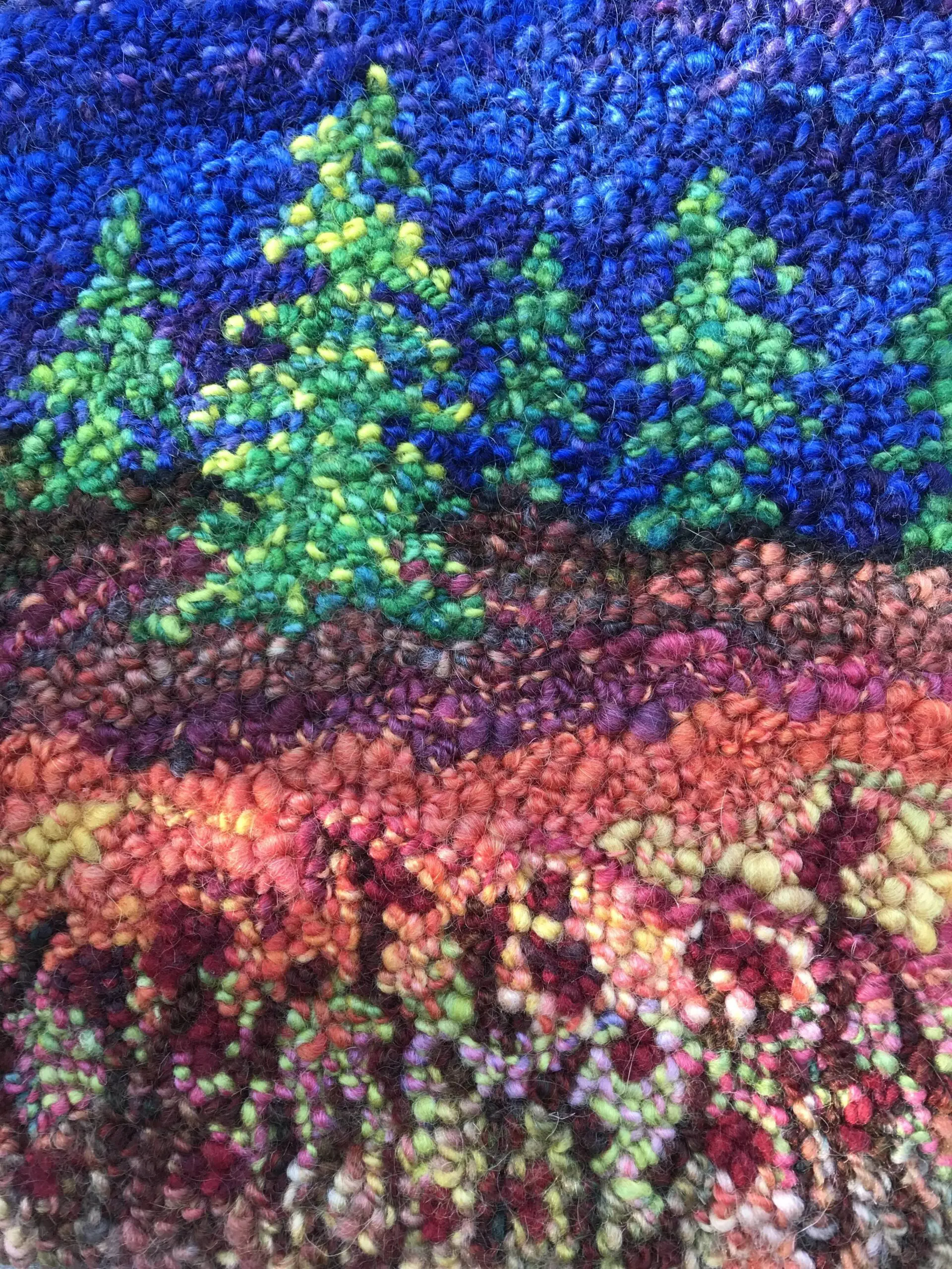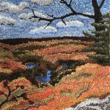 My current work reflects an exploration of color in dyeing, spinning, and rug hooking. The hooked mats are made with locally sourced wool that I’ve hand dyed and spun into yarn. I generally sketch from life or photos to develop an idea for a hooked mat, finding inspiration for both the image and color in nature. The image continues to change as the piece evolves.