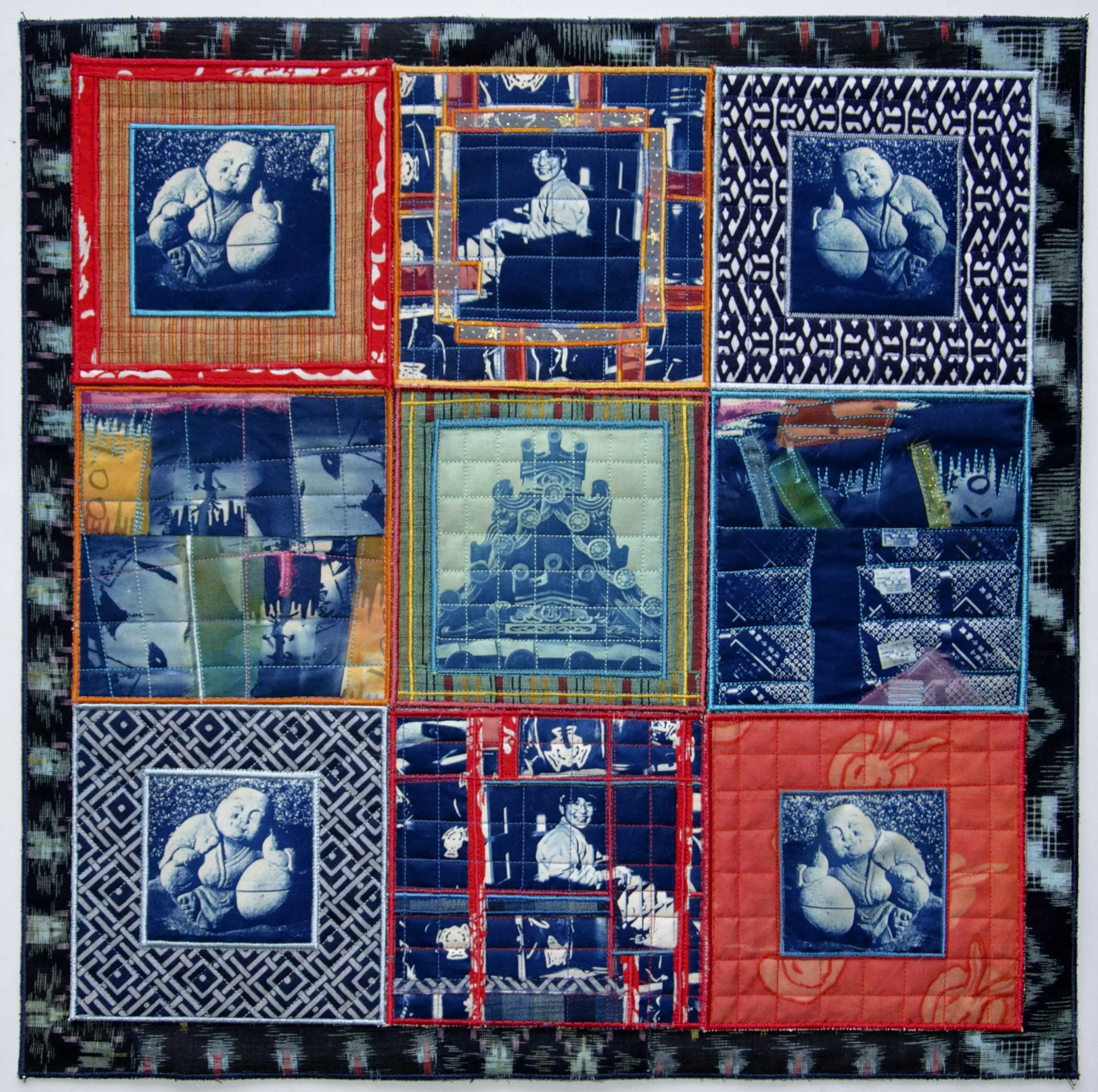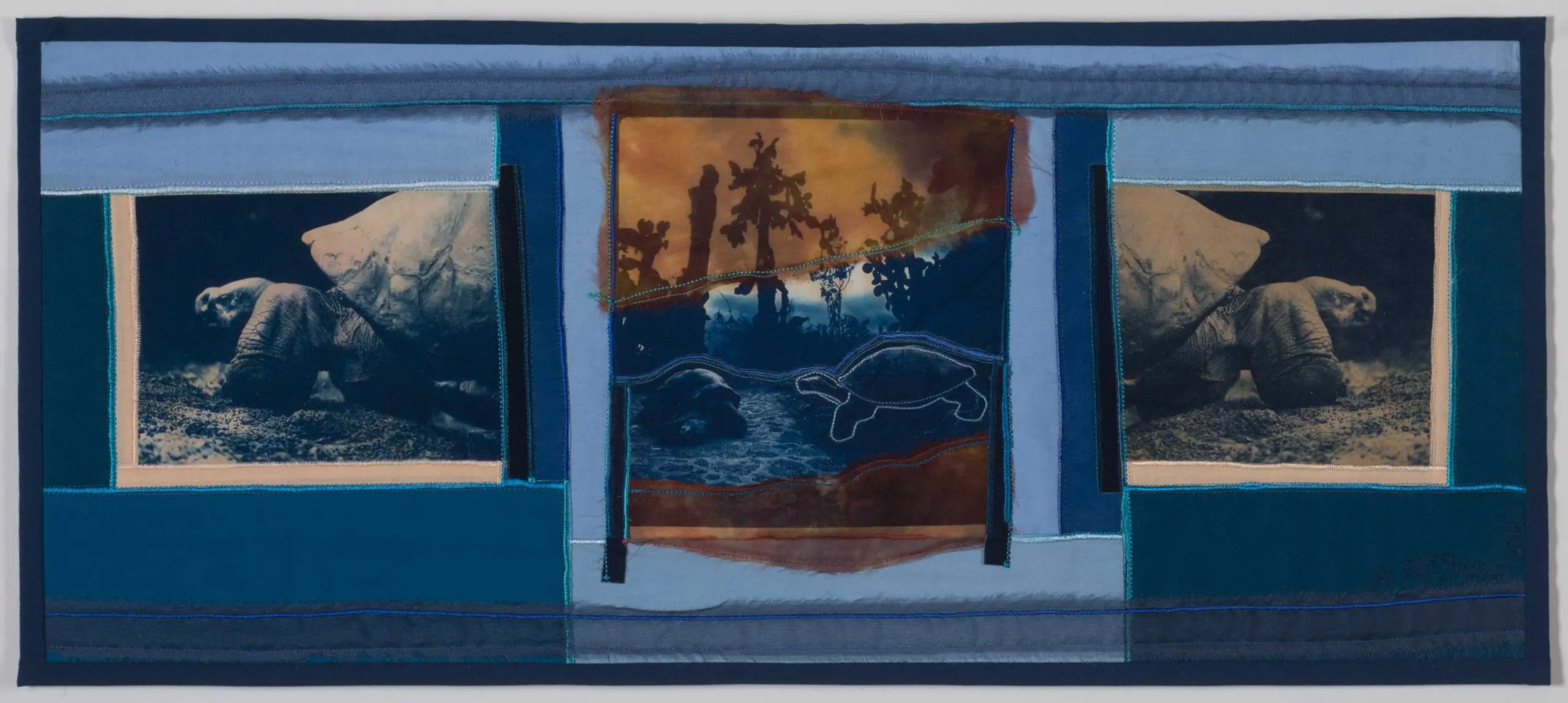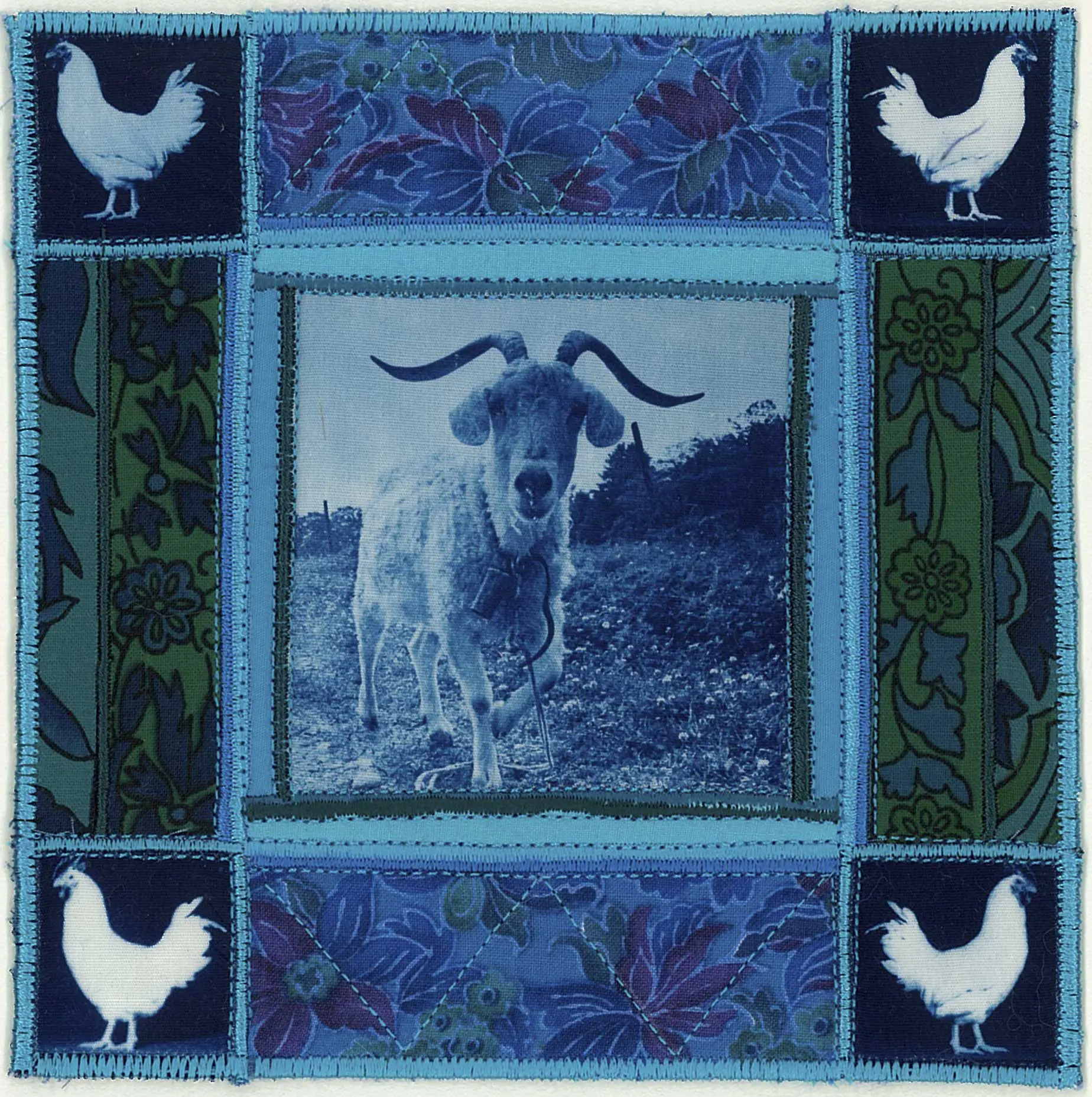 My art form is the cyanotype art quilt. It is meant to be hung on the wall like a painting. I began making these in the mid 1970’s. They are “story quilts”, documenting events, places, or experiences in my own life as well as sometimes the lives of others. My quilts are composed of cyanotype photographs that I make myself. My work is in both public and private collections and is included in many books and periodicals. It has received two Ballentine Best in Show awards (1980, 1987) at the League’s juried shows. My pieces are now being included in invitational, historical survey shows about the beginning of the studio art quilt movement.