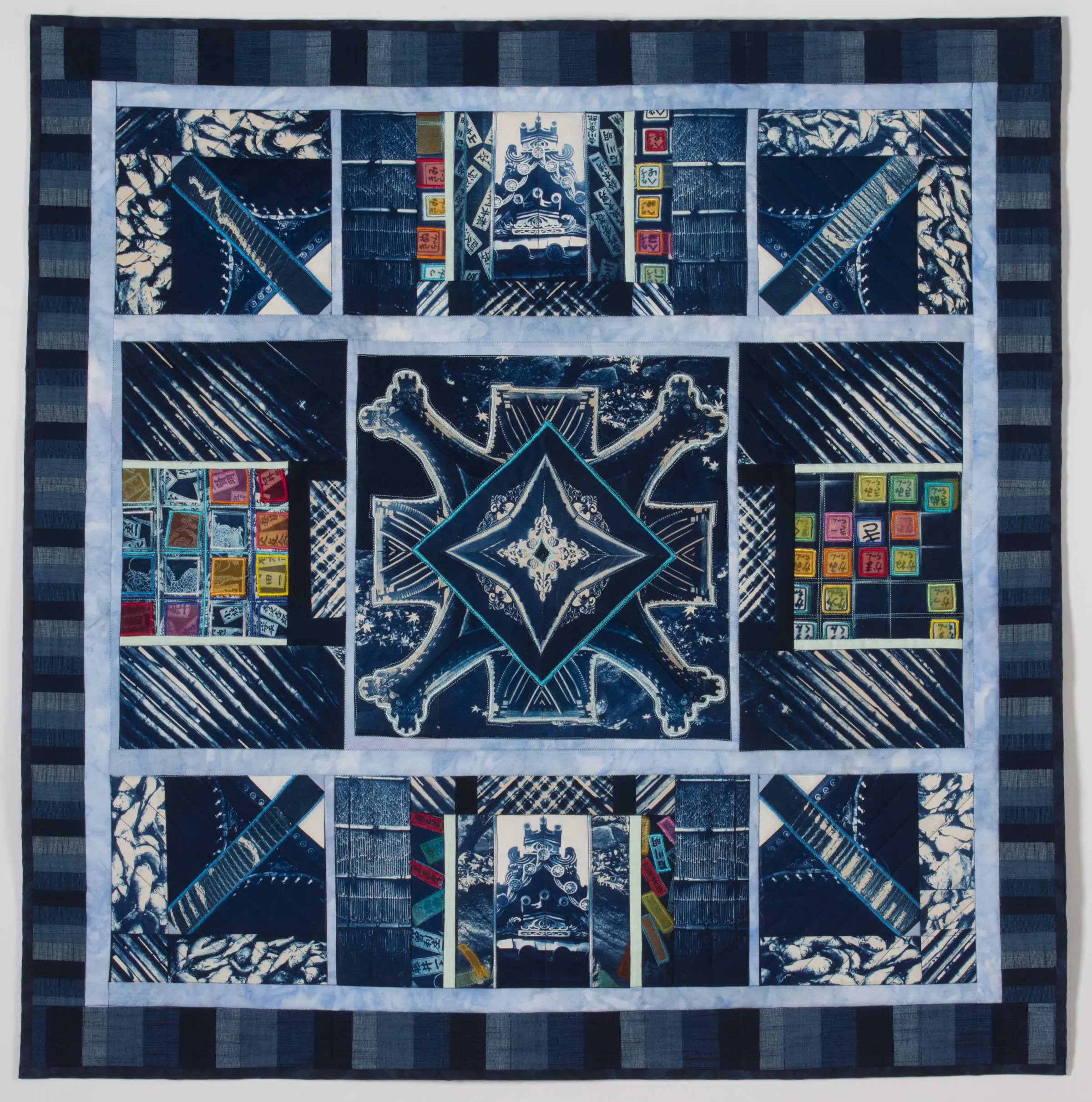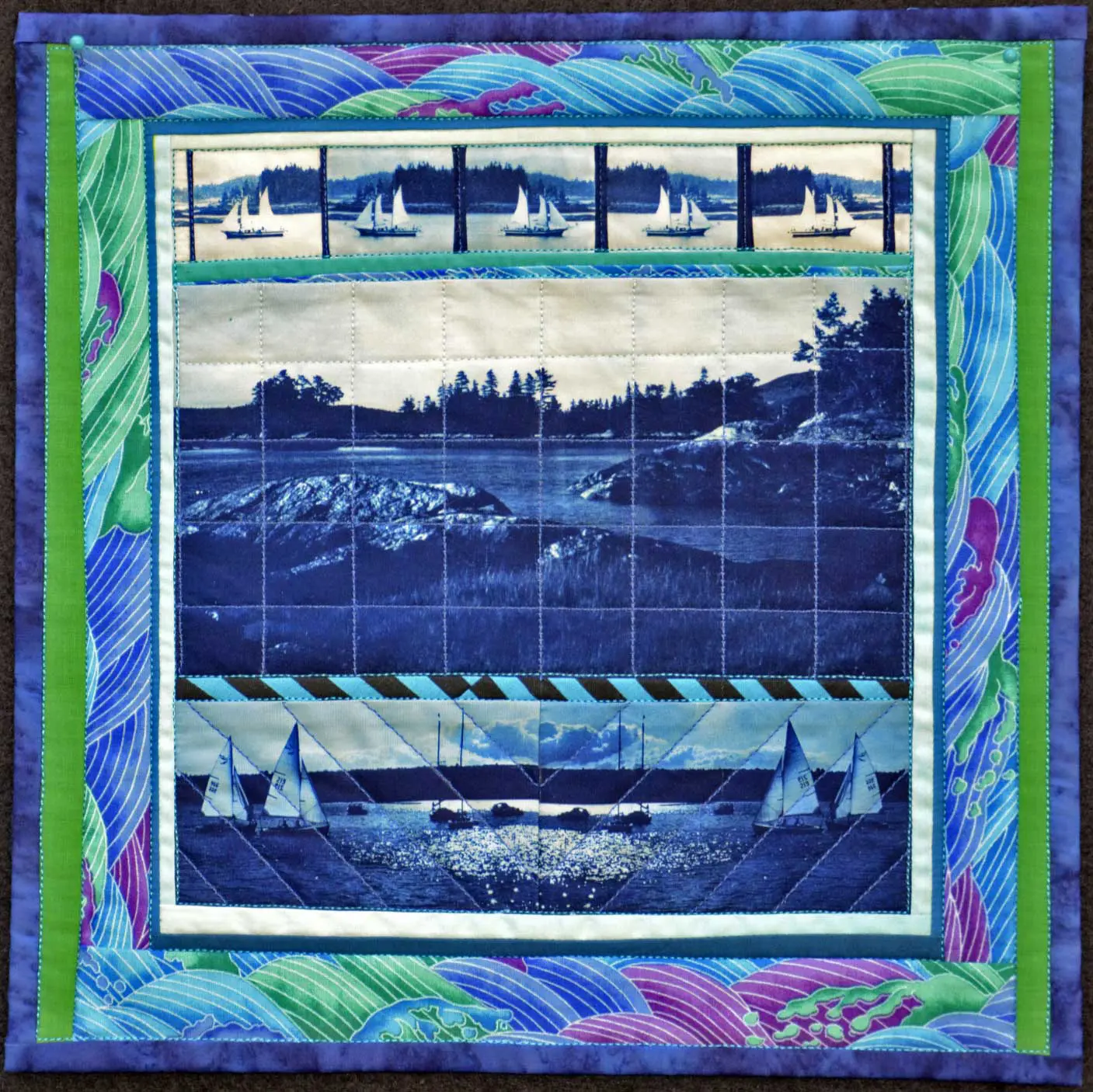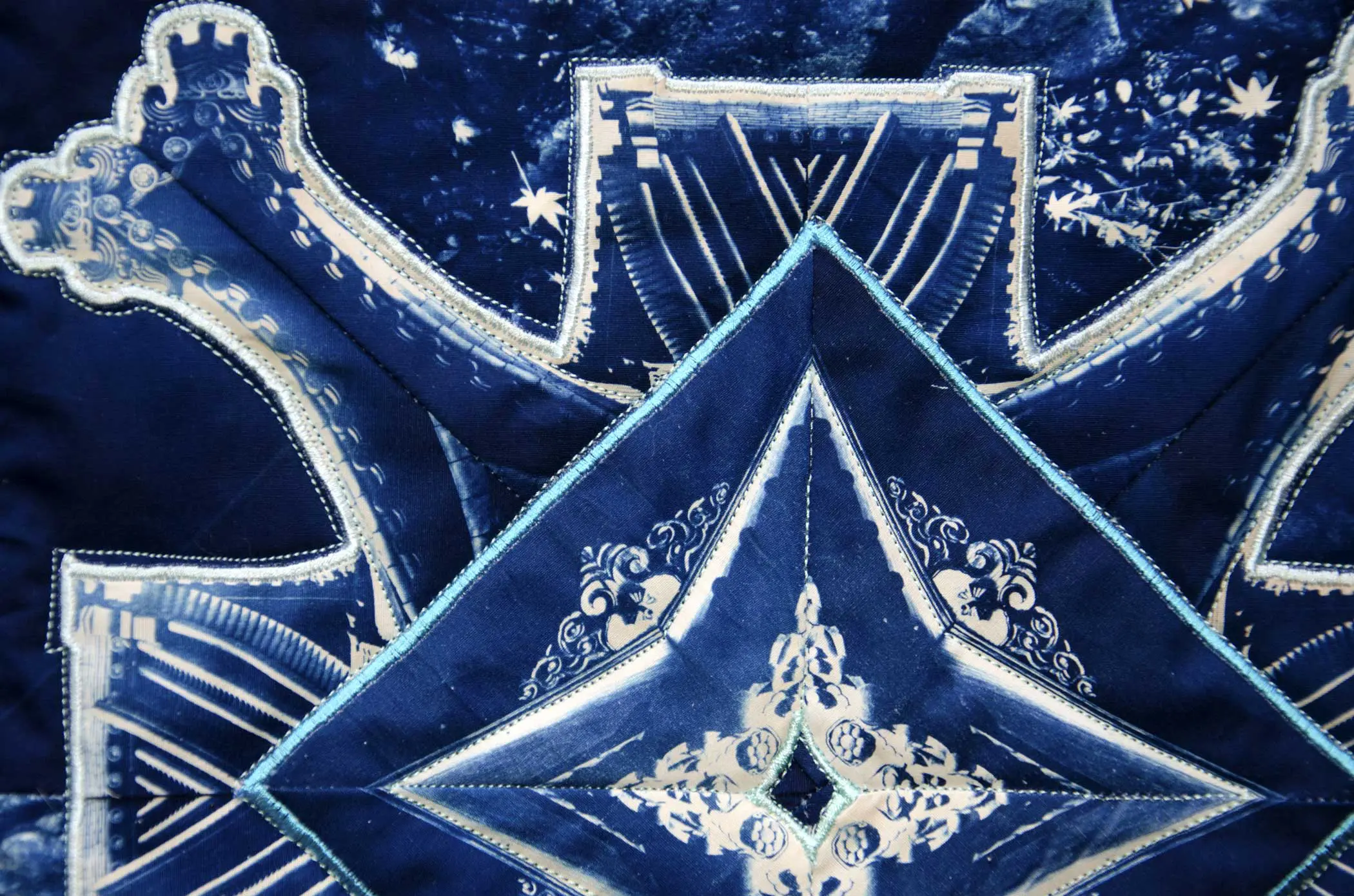 My art form is the cyanotype art quilt. It is meant to be hung on the wall like a painting. I began making these in the mid 1970’s. They are “story quilts”, documenting events, places, or experiences in my own life as well as sometimes the lives of others. My quilts are composed of cyanotype photographs that I make myself. My work is in both public and private collections and is included in many books and periodicals. It has received two Ballentine Best in Show awards (1980, 1987) at the League’s juried shows. My pieces are now being included in invitational, historical survey shows about the beginning of the studio art quilt movement.