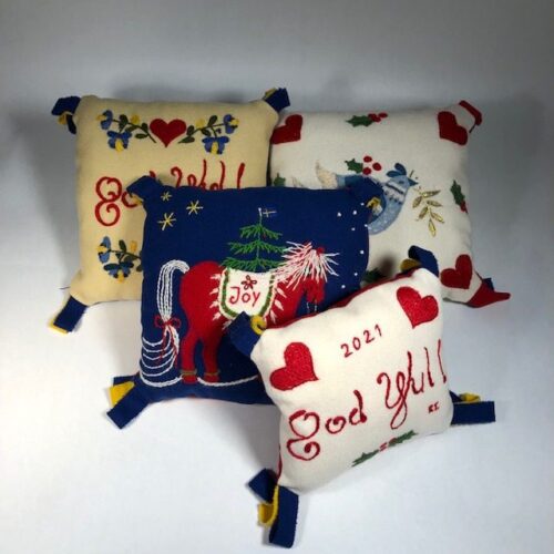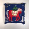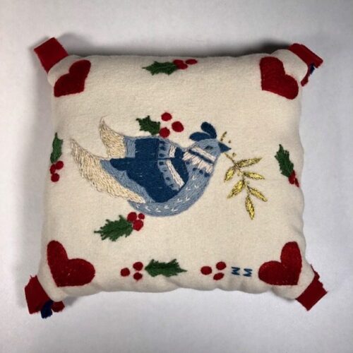 Crewel embroidered pillow by Brita Ek with a Blue Dove design; wool; 10″ square.