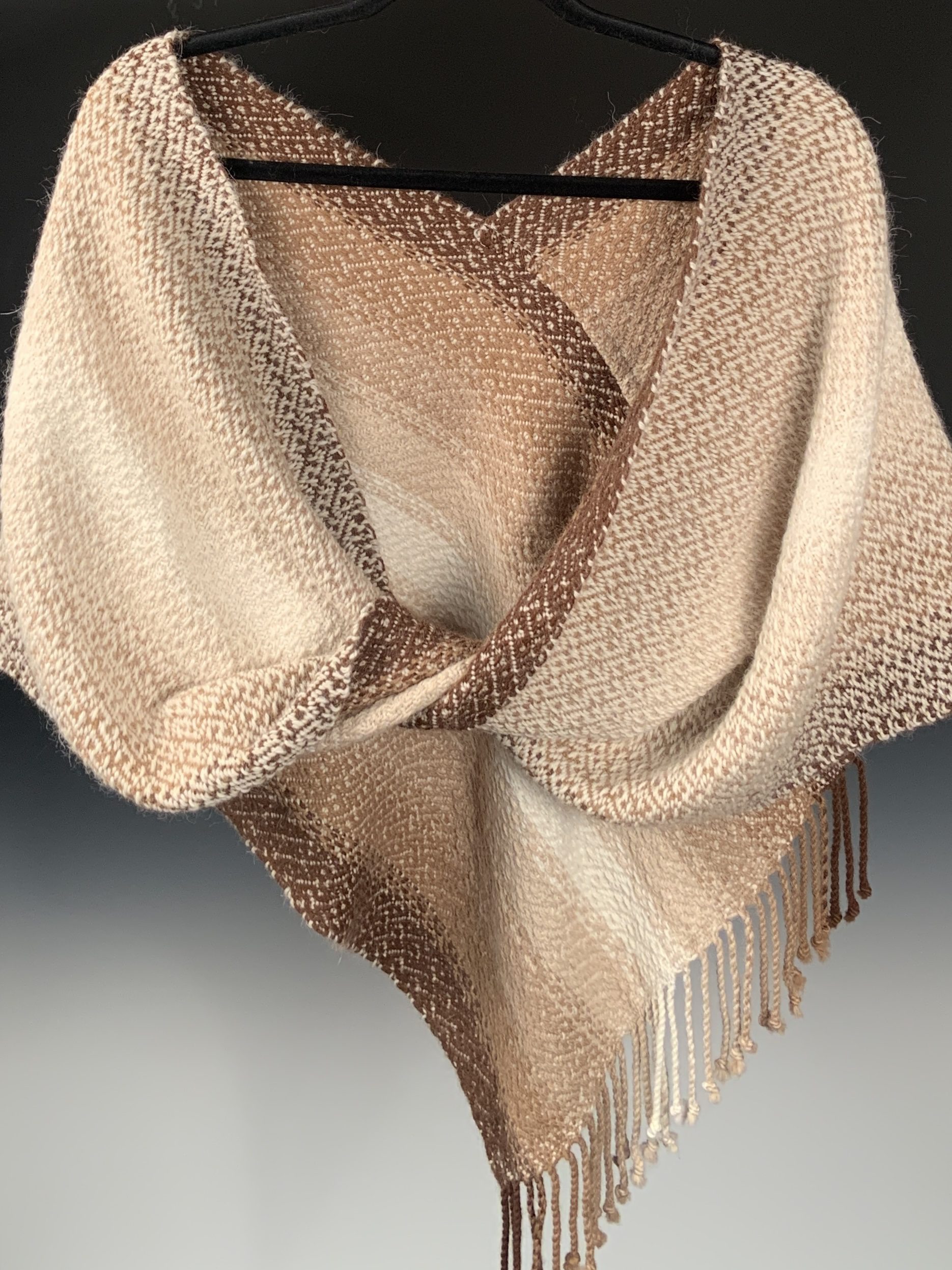 Reversible infinity shawl made from 100% Alpaca fiber in natural shades of brown and white