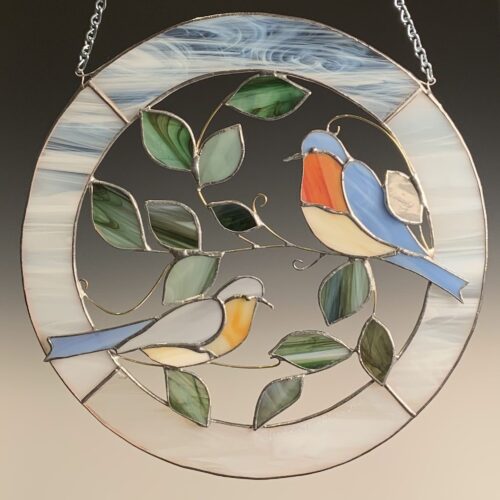 Two bluebirds in a beautiful piece of colorful stained glass by Cheddy Moller. Cheddy often makes her glass with layers of glass overlapping. She also often uses solder as a design element, and leaves openings within the circle, rather than filling it completely with clear glass. The effect is a light an airy, colorful piece for your window.