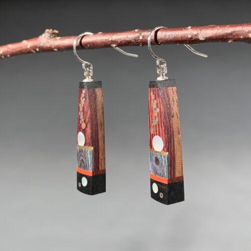 These lovely earrings by T. Breeze Verdant were made from ebony salvaged from the 1854 shipwrecked “Dolphin Schooner” off the coast of Cuttyhunk, MA, as well as a variety of other woods repurposed from other sources. Depicting the earth, moon and stars, and embellished with paua shell, copper, brass, and nickel, they hang from sterling earwires and come on a nice card with information about the shipwreck, their recycled materials, and the artist.