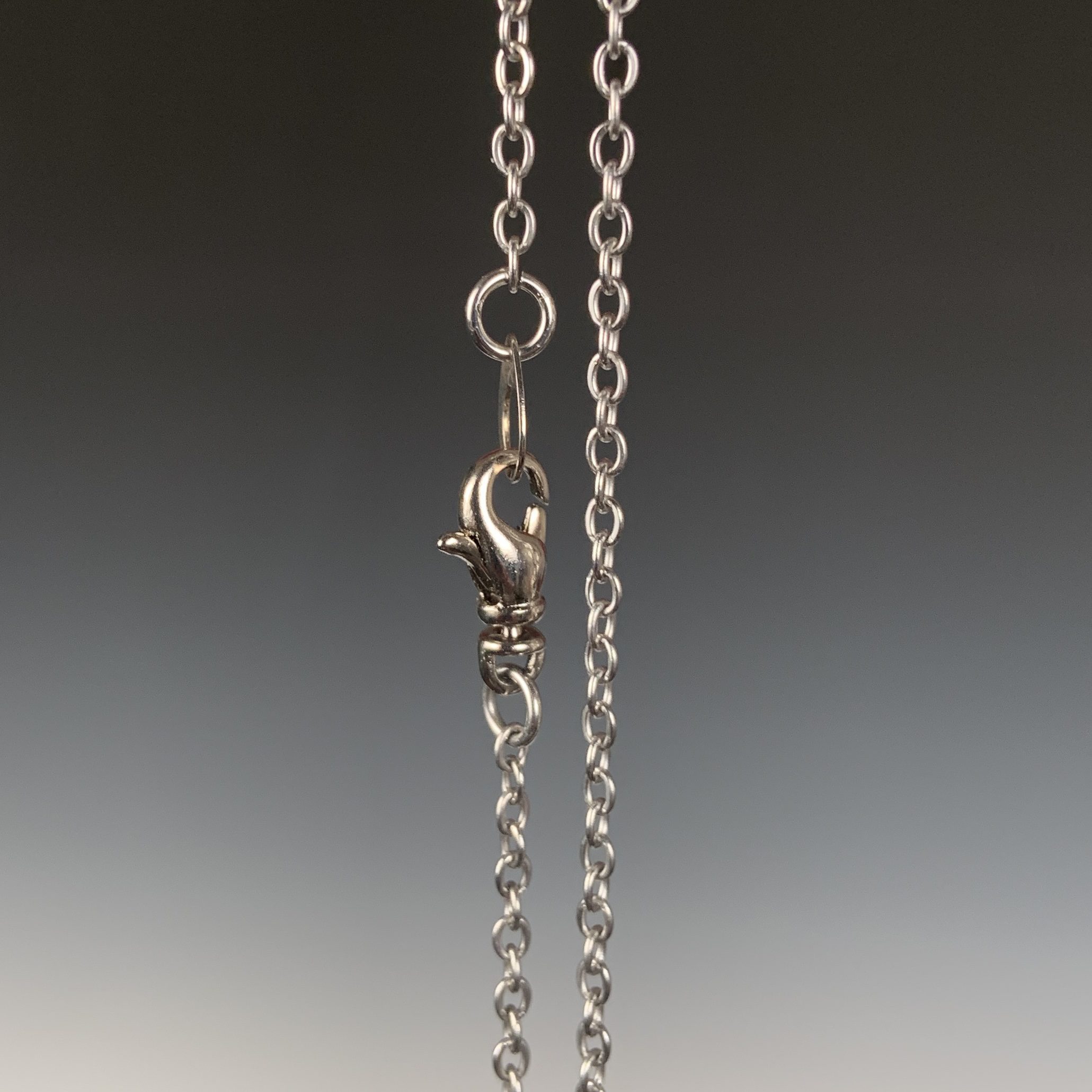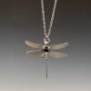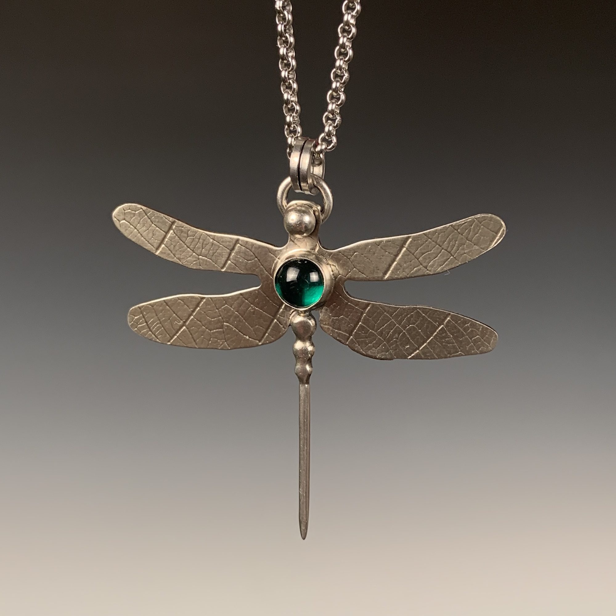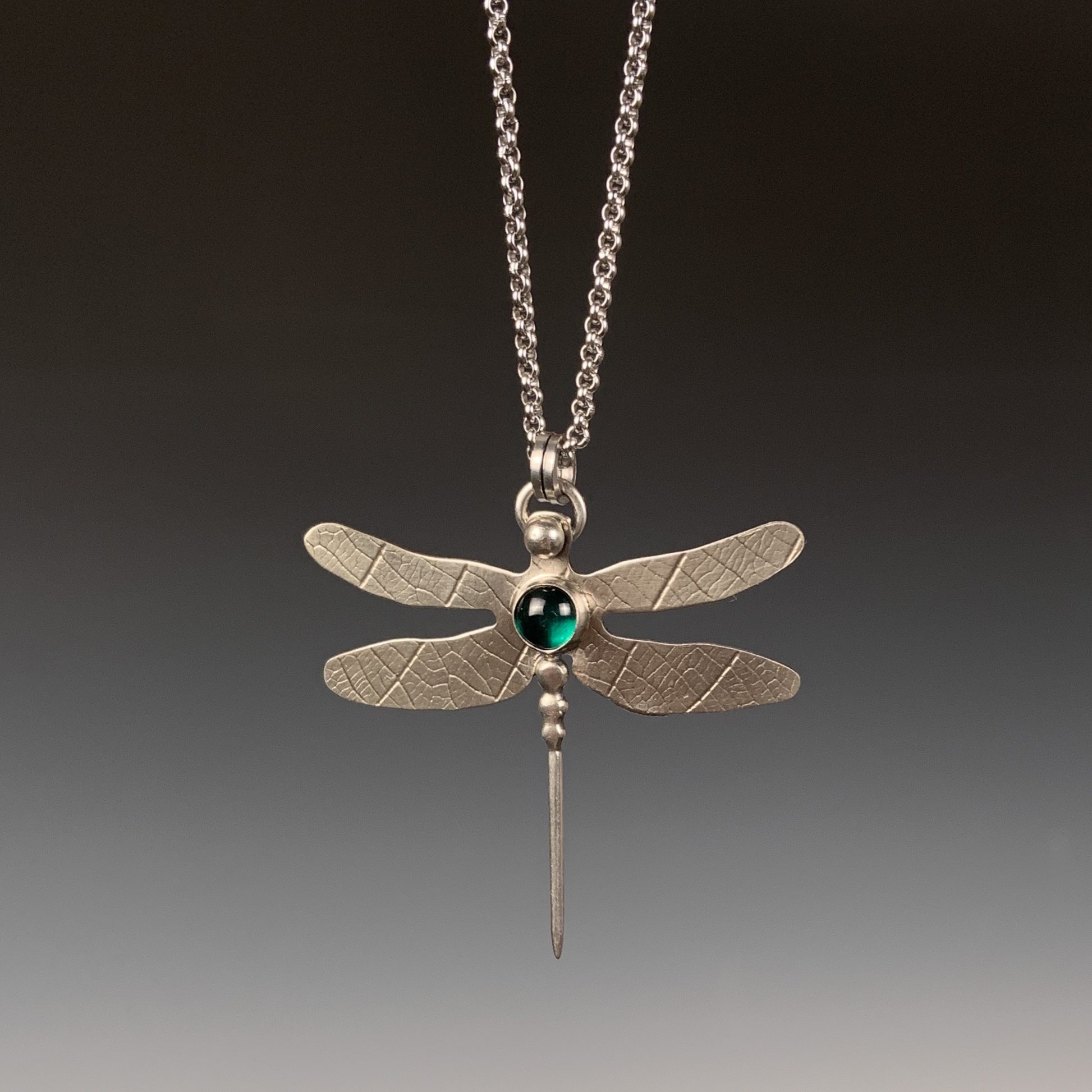 Elegant dragonfly pendant by Diana Beaulieu, featuring a luminous emerald cabochon, bezel-set in sterling silver. Finished with sterling silver ball details and a sterling silver chain, this artistic necklace is sure to draw attention. Diana’s beautiful jewelry pieces are all handcrafted and one-of-a-kind.
