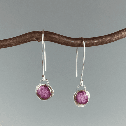 Sterling silver earrings with purple enameled copper made by Leslie Ishihara.