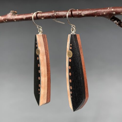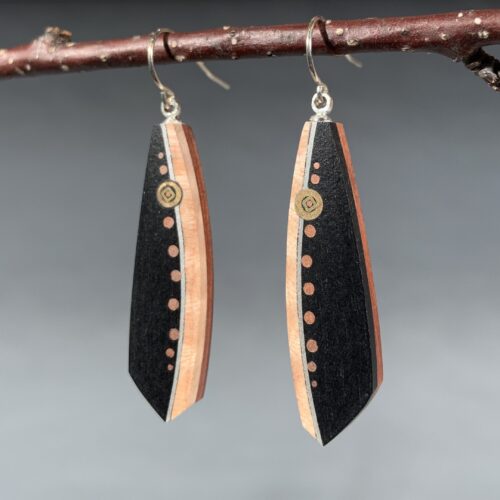 These charming earrings by T. Breeze Verdant were made from recycled musical instruments! This particular pair uses ebony piano keys, fiddle neck maple, bubinga from a guitar, brass from guitar strings, and copper from piano strings! Hanging from sterling earwires, they make a fabulous pair for anyone who is musically inclined. They come on a nice card with information about their recycled materials and the artist.