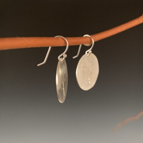 Beautiful sterling silver earrings by Jesse Mixer, featuring trees cut-out from round silver disks. Jesse begins all of her jewelry as original drawings, and then meticulously cuts out each piece by hand with a little tiny saw blade, rendering each piece individually, completely unique from the next. Often featuring landscapes, plants, animals, and her rustic New Hampshire lifestyle, Jesse’s charming jewelry has a well-loved, homegrown sensibility. Made from recycled sterling silver, with a brushed silver finish that pops white and enhances the tiny cut-outs.