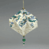 Beautiful hand-crafted pleated paper ornament with an orange and periwinkle swirled top, periwinkle bottom, and orange and purple beads by Ann Desmarais and Martha Whitney.