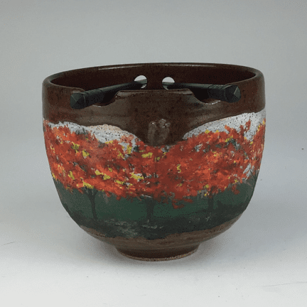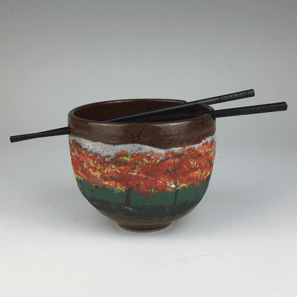 Ceramic rice/ramen bowl in “Berry Autumn” with a red-brown glaze and an autumn tree scene by Michael Gibbons.