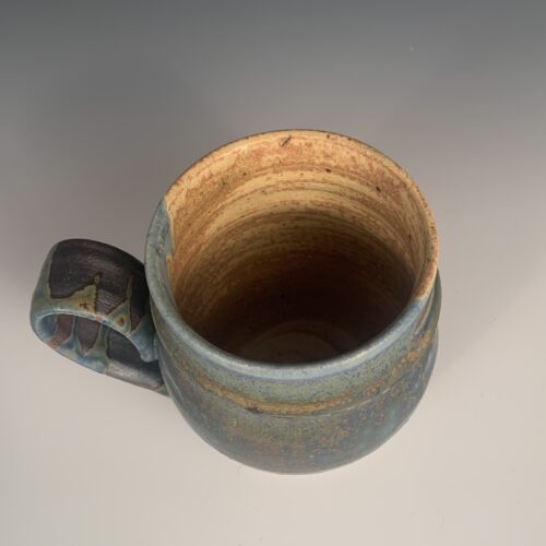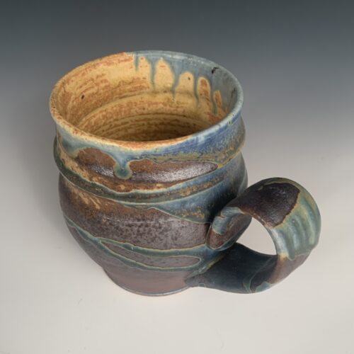 Enjoy your morning coffee in this beautiful mug, made by Jennie Blair in her classic down-to-earth style. Fired in a reduction atmosphere, the blue satin glaze with subtle gold speckling drips around and over the toasty clay. Jennie’s earthy pottery is always, expertly formed, and well balanced, with absolutely perfect functionality. Made with high-temperature durable stoneware, and lined with a mustard yellow glazed interior. Microwave and dishwasher safe.