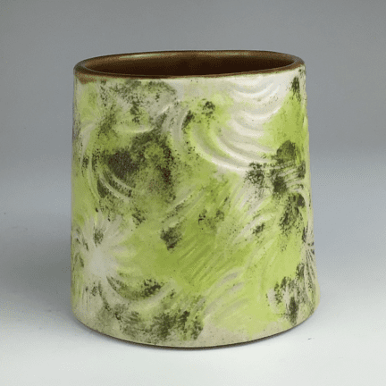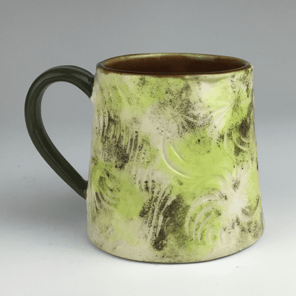 Handmade and hand-built ceramic mug with textured swirls in a green glaze and brown interior by Grace Kerr.