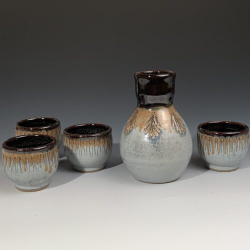 Beautiful “Peacock Blue” sake set by Karissa Masse. Karissa embellishes her pottery with carved details that guide her glazes down the sides in the heat of the firing. This sake set has a luscious speckled blue glaze running down the sides, and is finished with a strikingly contrasting tenmoku, a traditional Japanese glaze. Karissa’s pottery is always lightweight yet strong, with tactile elements that make it soft and comfortable to handle. Made with high temperature stoneware. Microwave and dishwasher friendly. Set comes with one bottle and 4 cups.