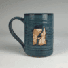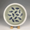 Handmade ceramic pie dish with a blue rimmed exterior and a green interior with painted leaves.
